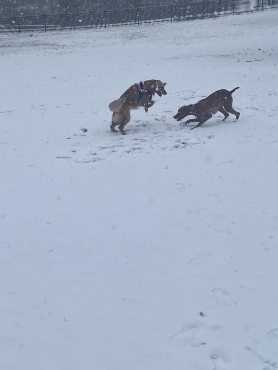 Taken about 30 minutes ago at the dog park near The George Bush and the Tollway... (Beauregarde on the right) Now, it's a consistent snow with sleet blend and is pretty much sticking to the roads.