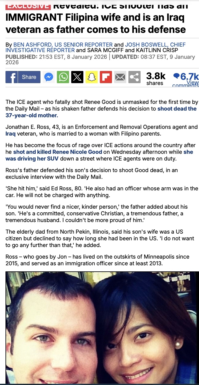 The murderous ICE agent has a wife imported from the Phillipines. Apparently. She hasn't been seen since the agent's name was publicized. And oh yeah somehow the dumbfuck who shoots at moving cars is a firearms instructor, too. https://www.dailymail.co.uk/news/article-15447739/ICE-shooter-Filipina-wife-father-Minneapolis.html