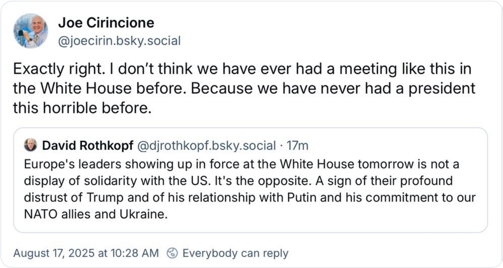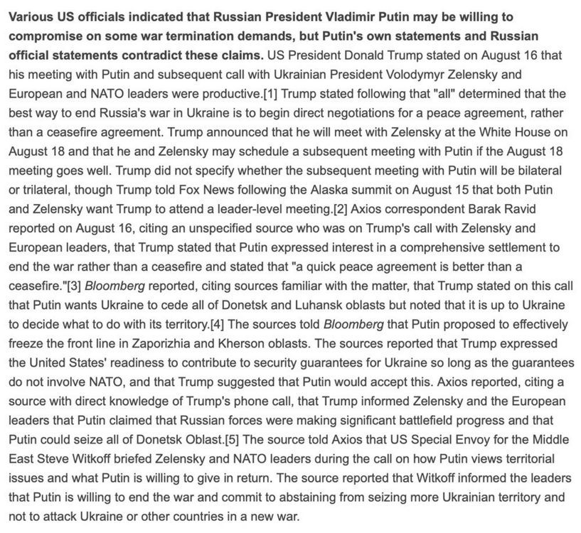 8. Institute for the Study of War summit wrap-up. Putin's pitch was basically give me everything i want and I pinky promise to not invade again. Trump's running with it as best he can with those cankles and bad ticker. https://www.understandingwar.org/backgrounder/russian-offensive-campaign-assessment-august-16-2025