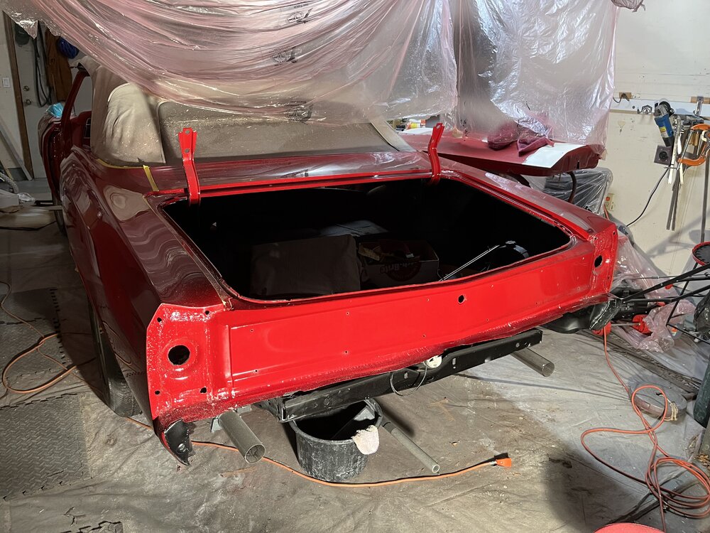 It ain’t pretty yet. I’m doing it all in a single garage stall including paint. It’s been a long process. Had the car since college about 1993. Started tearing it down years ago. Stripped to bare metal. Replaced most of both floor pans, both quarter panels and most of trunk floor. Taken off frame. I painted the BC/CC last winter but hadn’t buffed it out yet. So that’s what I’m doing now. Doors, hood and trunk lid still need to be painted. Interior has knock off dynamat. New AAW wiring harness is partly in. Engine was rebuilt a few years ago with very few miles. 350 block, Edelbrock heads, lunati cam. Trans is just a turbo 350 automatic. Hope to get my painting done before it gets cold and do a lot of assembly this winter.