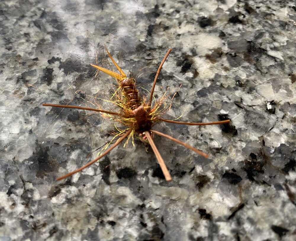 10. Tied my first fly today. To get out of Nor Cal, the family moved to northern Idaho and I go back and forth for work. Local store has free fly tying lessons in the winter. This is supposed to be a golden stone and looks pretty good if I say so myself because I had some oversight. The second attempt I was on my own mostly and it looks like I tied it with my feet.