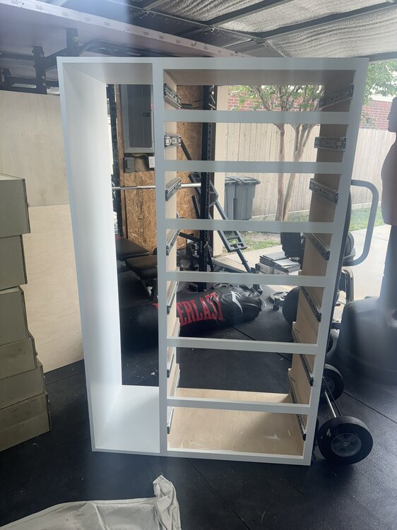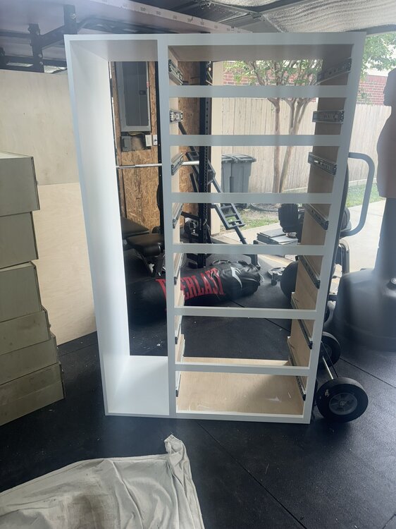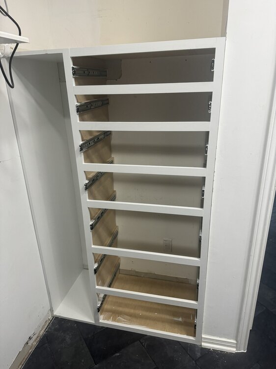 Almost done with my closet. I redid it (up thread) a while back, but already had an IKEA cabinet that I didn't have time to replace back then and it worked. The rest of the closet was all custom done. With a replacement of the floor I had to take out the IKEA cabinet and no way it was going back in. This is the bottom part, I'll be building a custom part up top with a rack mount for my server and APC I use to run my media throughout the house. But I had to get this in first to know what space I had exactly to do it. Still some work to do but not sure I have it in me today. Need to install the drawers then set the drawer fronts and install drawer pulls That looks fantastic!