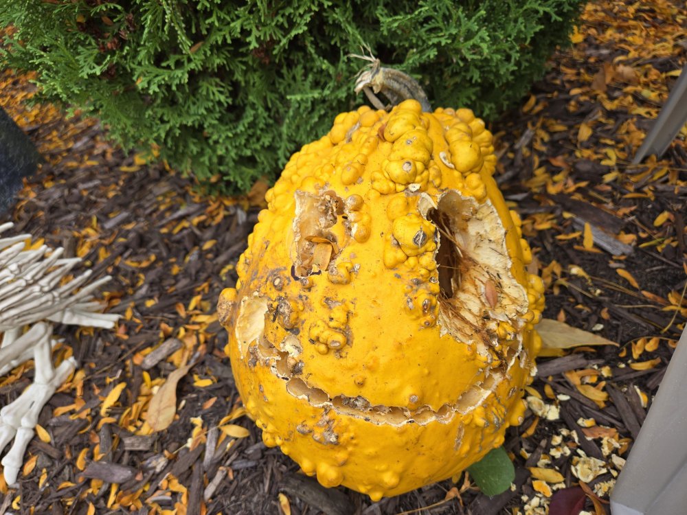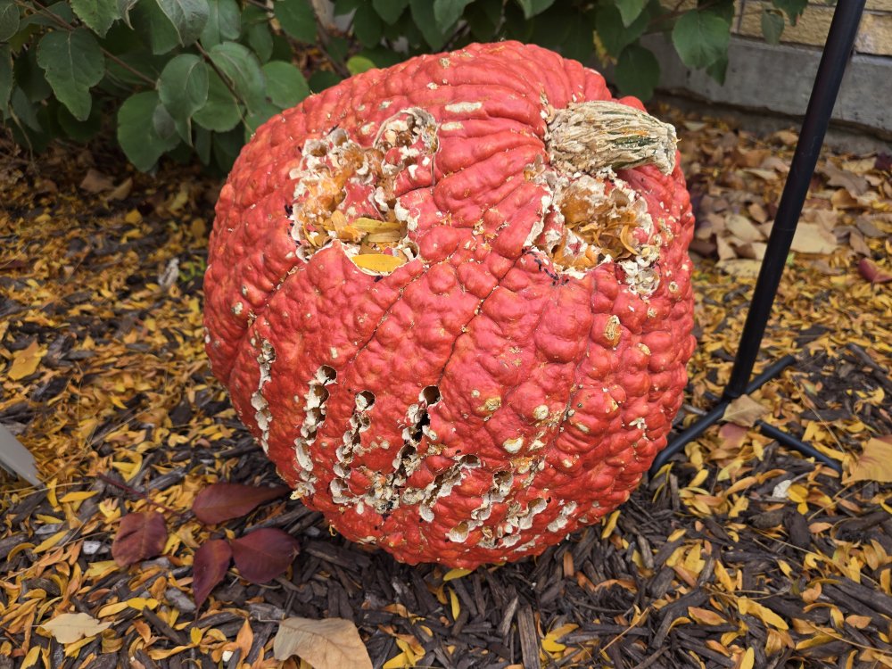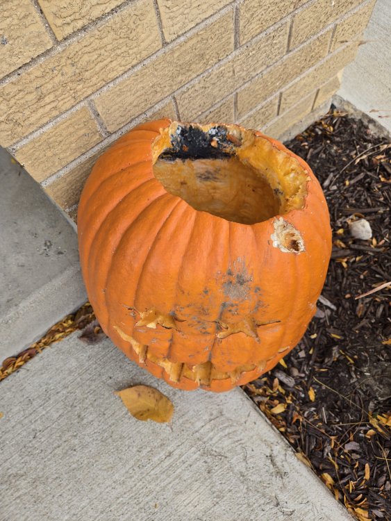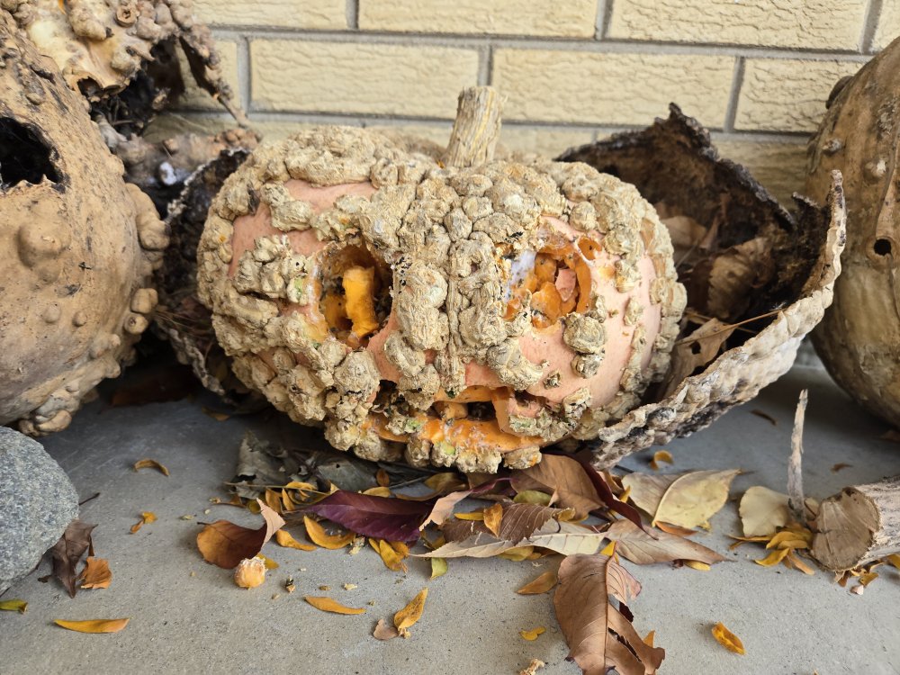 20. It hasn't even been four days. The weird thing with the "peanut shells" is doing fine, and so is the big reddish one, but the smiley face and the conventional pumpkin are getting torn up by varmints, and mold is also setting in for the conventional pumpkin (its lid has also fallen in on itself...).