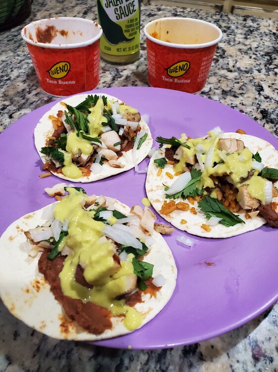 13. Street tacos outta Bueno Whole Lotta Box remnants (rice and beans), leftover grilled chicken, and TJ's jalapeno sauce.