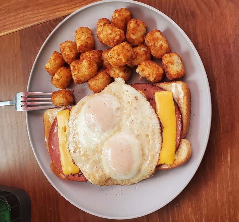 16. Son wanted breakfast but I didn't have any breakfast meats in the house. But I did have bologna. And Duke's. Apologies for the plastic plate and metal fork.