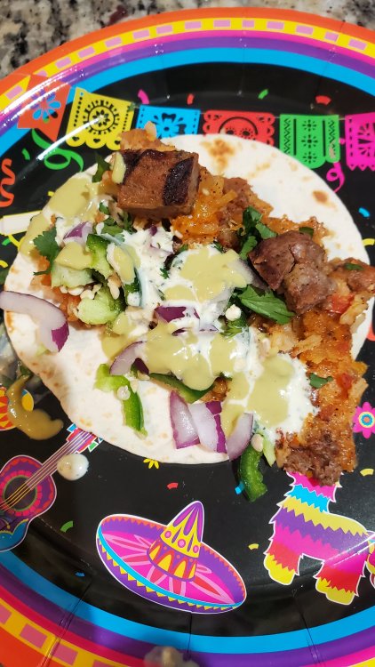 11. Could cross-post in the "trivial things that please the..." thread- when the leftovers are better than the actual meal. Had a big gathering of folks from my wife's family last night at the original El Fenix. It wasn't good. Food was pretty much room temp, service was off, all that. I chalked it up to one server waiting on a humongous party, so whatever, who gives a shit. Wife and I got both versions of the fajita cheese enchiladas- one topped with chili con carne and beef fajita meat, the other sour cream style topped with fajita chicken. Took most of it home. Tonight I decided to make tacos wth the leftovers. So we've got enchilada tacos with the accompanying rice and beans, fresh japs, onions, cilantro, homemade copycat Chuy's creamy jalapeno, and Salsa Dona. A thousand times better than the sit-down dinner we had last night 🤘