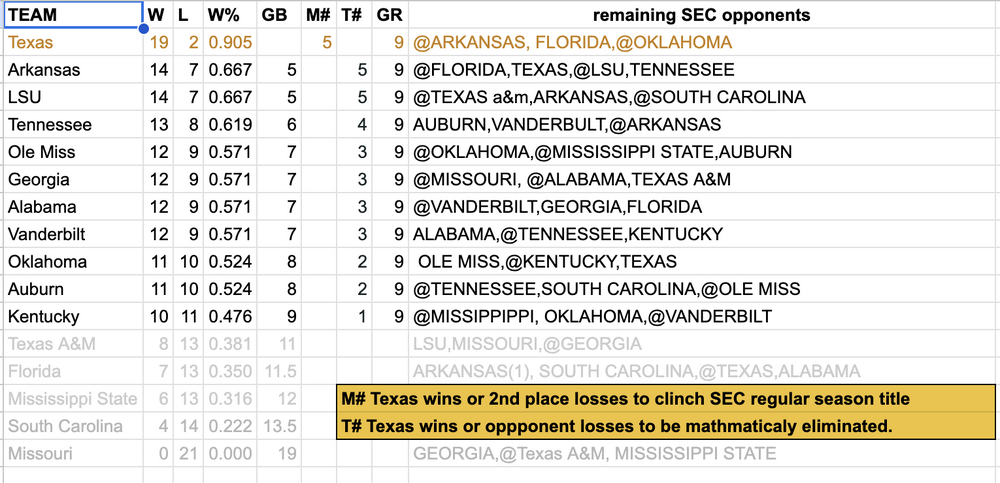 4. Everything stays the same Magic # wise at 5. Arkansas moves up 1 GB to 4, everyone else .5 games. No one else is playing in the SEC tonight. We were pretty lackluster against LSU game 1. On to tomorrow...