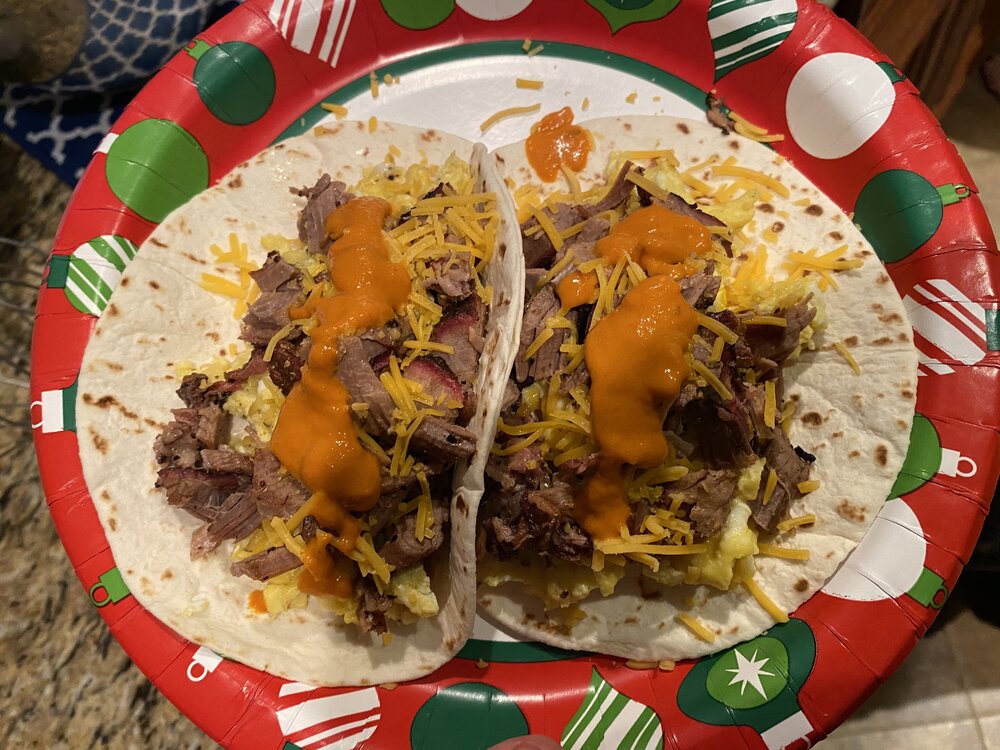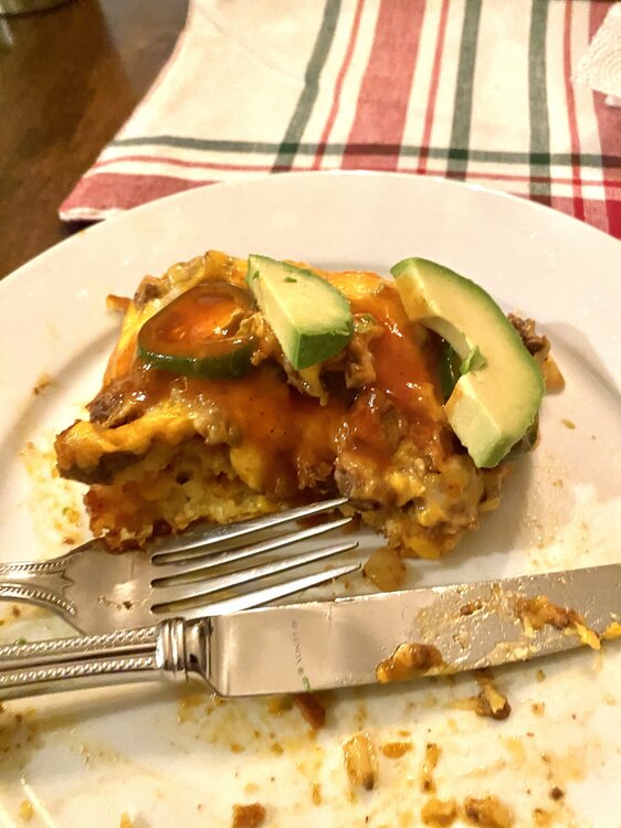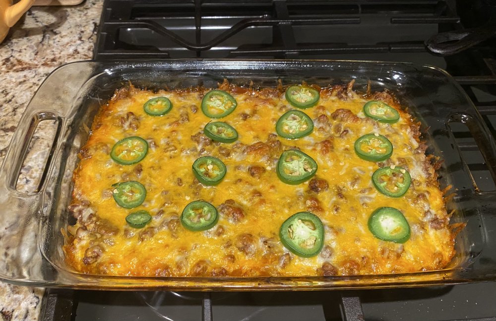 Mix jiffy mix, egg, creamed corn, sour cream and put in greased baking dish for 20 min. Meanwhile, brown beef with all the diced onion and salt to sweat the onions. Drain beef, then add garlic first, then put back beef and add cumin, chili powder, salt, pepper. Poke holes in the cornbread when it’s done and pour half a cup or so of enchilada sauce (just kinda cover it), then add beef mixture. Cover with cheese and more enchilada sauce, too with jalapeños and bake for 15-20 min in 400 degree oven.