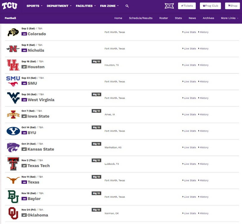 Looks like today is the day, which also means looks like early exit negotiations didn't work. Also, TCU's staff dropped the ball early and put it on their website and schedule snoops scraped it: They're playing every team in Texas, which doesn't seem like a random event.
