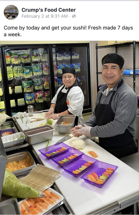 2. Wait a fucking minute. Crumps - the grocery store in Linden - serves sushi? 😂 That’s the most amazing thing I’ve heard all day. I’ll have to make some inquiries about this.