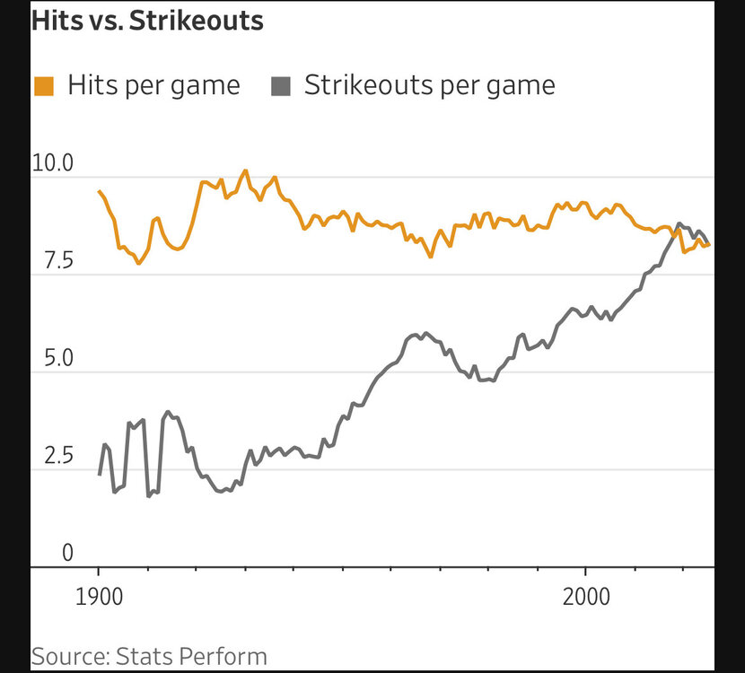 7. # of hits just flipped to be greater than # of K’s for the first time since 2017 (albeit just barely) https://www.wsj.com/sports/baseball/mlb-hitters-strikeouts-cd09ac73?st=dNrb37&reflink=article_copyURL_share