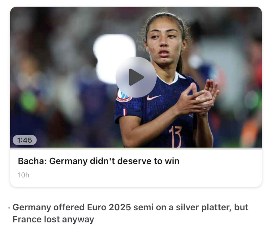 Great paragraph from ESPN’s game summary. I will include the paragraph before. ”Germany were not making things easy for themselves. Sjoeke Nüsken had a penalty saved in the 68th minute, and the former champions were struggling in attack with only seven shots, compared to 18 from their opponents. The majority of referee Tess Olofsson's calls also went against Germany, with only a few being correct. She called 50 fouls across 120 minutes -- but only showed five yellows -- making the game too stop and start for either team to really get going.” https://www.espn.co.uk/football/story/_/id/45776906/germany-defy-odds-reach-euro-2025-semifinal-france-crash-yet-again What a fucking sentence! France is devolving into Un pays de merde! and their women’s team is a shining example of this. They are such trash. Really enjoyed seeing them lose to a 10 woman squad from Deutschland! A team of whiny cheating cunts.