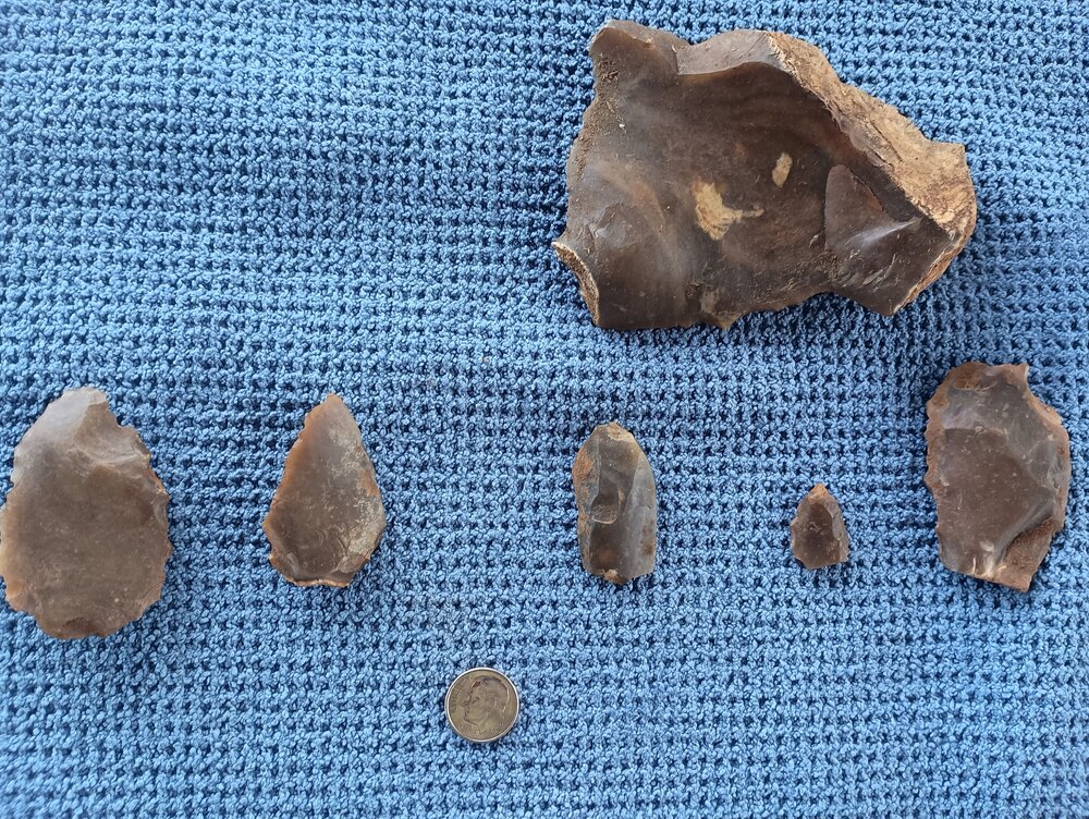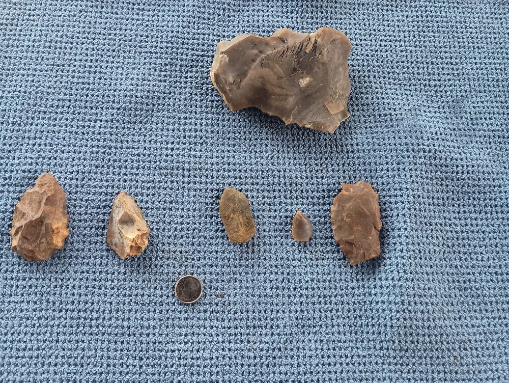 14. Total newb here, but I was visiting my mother's place in Kyle and noticed a bunch of flakes on a hill on her property. Found a few promising pieces on the surface, which look like they've been worked but certainly aren't the obvious symmetrically perfect arrowheads a lot of people are posting. Top one kind of looks like a scraper of some sort, even has a nice indentation for the thumb. Left 2 have the best shape, but the other side of each isn't finished (see pic of reverse below). Not sure about the other 3 but they seem to be roughly the right shape and look like they've been worked. Maybe got some rejects they started or my imagination is seeing things in an otherwise completely natural rock. Reverse- Anyway, if these are promising and are actually man made, what's the next step to find more? I tried putting a shovel in the ground and hit rock almost immediately.
