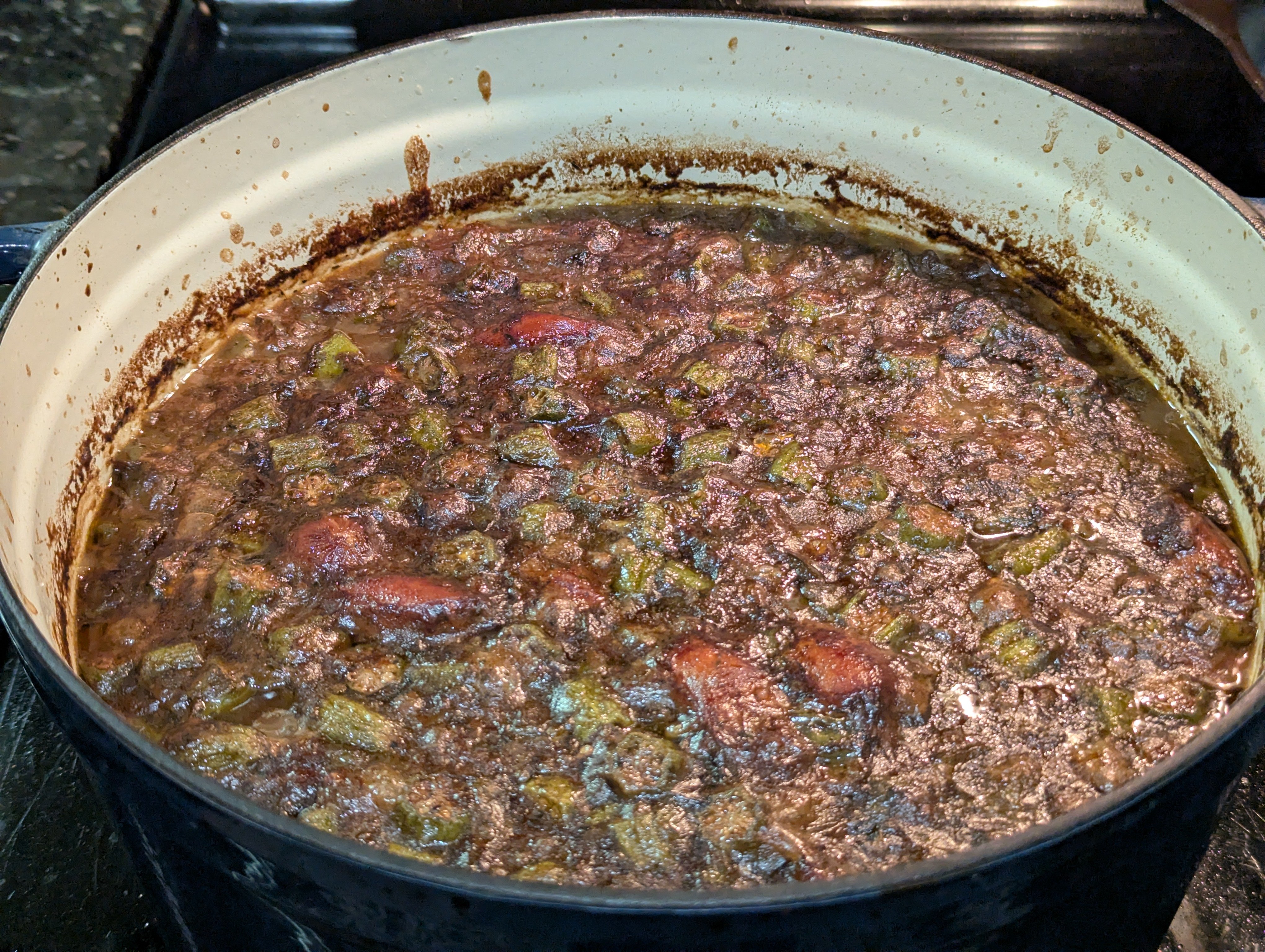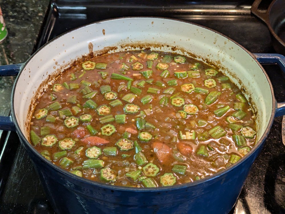 Oh hi recipe notes for next time: little bit of a fridge/freezer cleanout: 3/4 cup oil 3/4 cup flour 1 quart chicken stock 1 pint shrimp stock 1 large white onion + bits of a red onion leftover 3 ribs celery 2 large green bells whites of all the green onions growing in the fridge 1 pack fresh okra 1 pack tasso 1/2 pack costco "andouille" from the freezer 1 pound krab that's been in the freezer for a while 2 big teaspoons chicken base 3 tablespoons worcester 2 packets of soy sauce remaining 1/2 bottle homemade cajun seasoning rest of a bottle of crystal (tbsp?) tony's to taste 2 quarts (iirc) filtered water first you make a roux. added celery + bells, stirred and waited for the fire alarm to quit going, added onions, stirred more, added spice blend to bloom, then started adding hot stock in a bit at a time to not break the roux as fast, then half the sausage and the tasso browned, then into the oven half lidded while i went to HEB (it was open) to look for okra (out of frozen and only a couple packs of fresh left), add in okra, back into the oven to go for a bike ride for a couple hours, add remaining sausage, take a shower, add krab, empty dishwasher, done. garnish with the scallion greens, serve with jasmine rice and butter toasted baguette. makes 5 quarts- NFL Week 18_ 2 pseudo playoff games and the NFC#1 Seed up for grabs