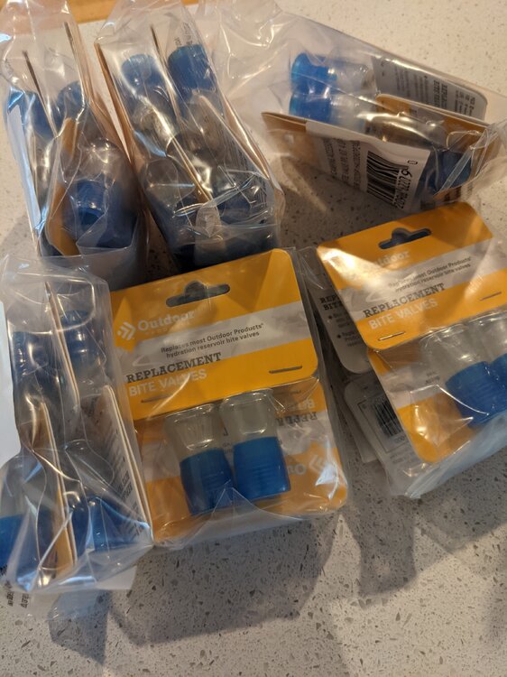 This is so random, I'm not even sure where to post it. We're heading out on a camping trip this weekend and I ordered a pack of 2 bite valves from Walmart to replace one the kids had chewed through. They finally showed up yesterday, yeah! Only thing is, instead of sending me a pack of bite valves, they sent me a case. I double checked and they only charged me the couple bucks for a pack, but now I'm flush with 48 bite valves. An embarrassment of riches is what it is. After 18 months of lockdown, multiple deaths in the family and social/political chaos, things are finally looking up! So the question is, does anybody need some bite valves? What would you do with them? Step 1: Magically procure bite valves Step 2: ??? Step 3: Profit