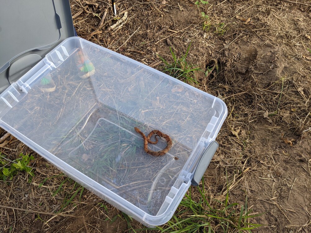 We were camping at Old Settlers this past weekend and found this guy in the middle of our campsite. We had already been there 3 days when an 8 year old almost stepped on him, so no idea where he was hiding before that. My 10 year old is a snake fan, so we managed to relocate him to the edge of the property. Looks like he might have been injured before we found him, so don't know if he made it. We heard there were a number of copperheads found throughout the campgrounds, most weren't lucky enough to be relocated.