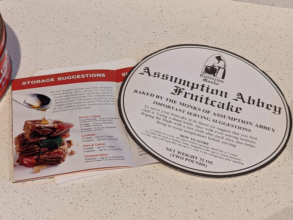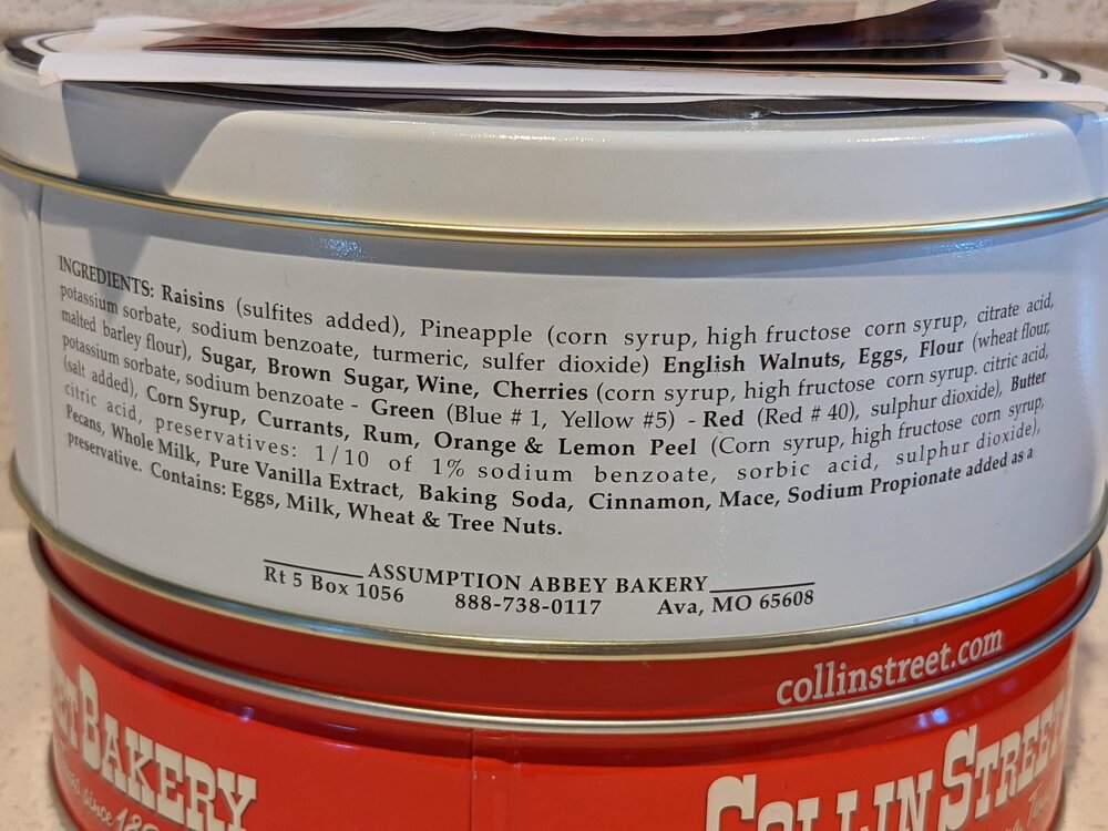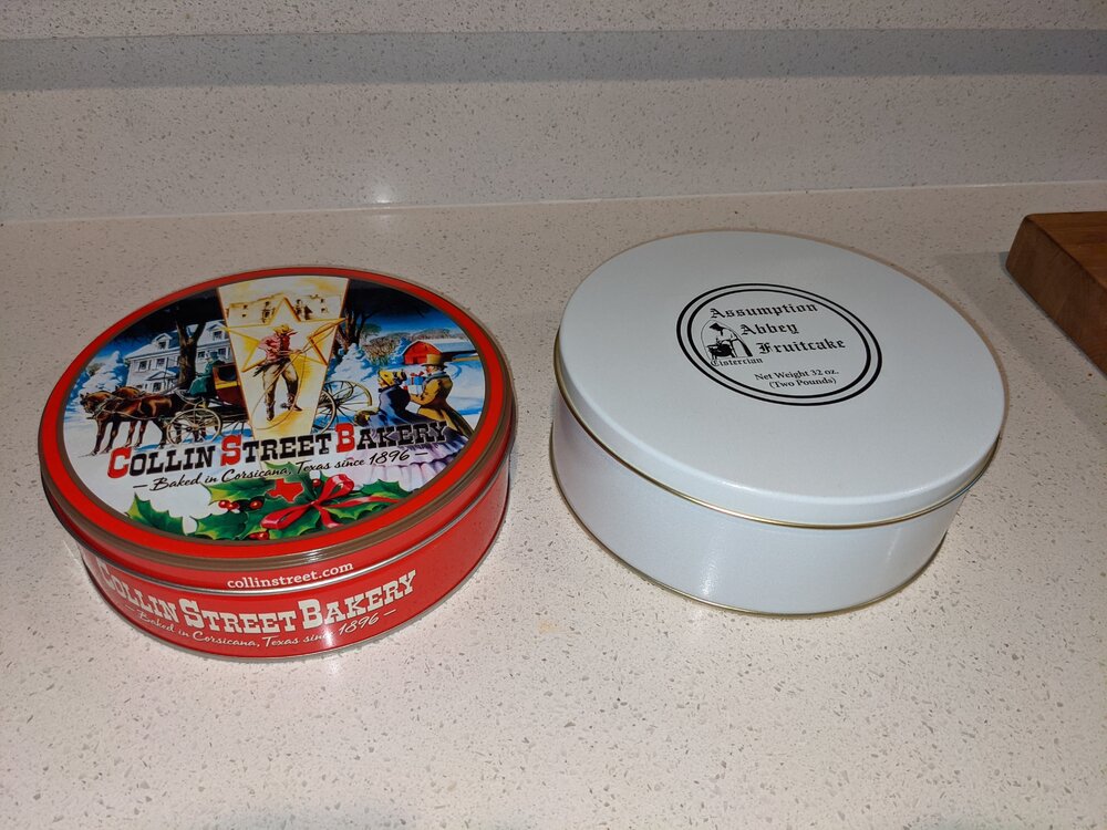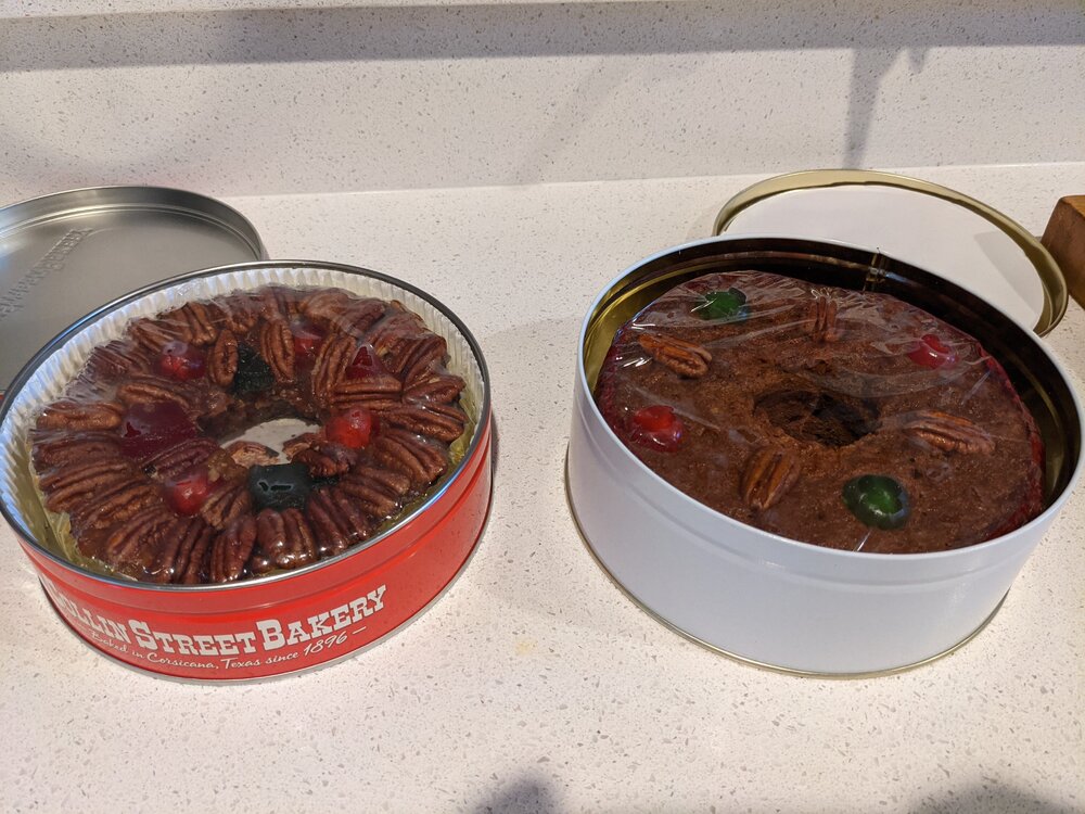 TLDR: I like fruitcake and took pictures. Growing up, my grandparents and great-grandparents would always have fruitcake in the house for Christmas. It would live on the kitchen table and was up for grabs to pair with your breakfast or a cup of coffee or just as a snack. It generally wasn't for dessert, which was the exclusive domain of pie. Fruitcake always came in a tin, and the tin was always saved for storing and sharing Christmas cookies. As a kid, I didn't have much of an appreciation for fruitcake. I craved straight up sugar, and that's not what fruitcake offered. But, I relished those candied cherries on top and over the years the fruitcake tin on the table became an enduring symbol of Christmas with my family. As I grew up, I eventually learned to appreciate the deliciousness that is fruitcake. It was a quintessential tradition that I could observe passed down from one generation to the next.Over the years, life got complicated and it was difficult to get back home for Christmas. We had fewer opportunities to gather together and that shared fruitcake on the table became a less common sight for me. The family elders passed over the years. My last living great-grandmother passed nearly 20 years ago and my final surviving grandparent (my mom's mother) passed away earlier this year. Last year she buried her last living sibling. This year she buried the first of her daughters. I think that was enough for her. A void's been created that leaves me missing those traditions of Christmases past.Thus, I felt compelled to bring the fruitcake tradition to my nuclear family and create that experience for my own children (now 10 and 6). But, does the fruitcake of my youth deserve to occupy the prominent space on my table as the fruitcake of the future? I wasn't so sure. And so, my search began to discover whether a fruitcake exists that can supplant my grandparents' favorite.Last year I ordered two different fruitcakes and enlisted the family to help me evaluate which is best. The offerings for consideration: #1 Assumption Abbey Fruitcake from Ava, MO - This is the fruitcake my family would always order. Probably because my dad's family was Catholic and they valued the connection to the monks. These are Trappist monks and hence they make Trappist fruitcake. They make good beer and good fruitcake. Apparently there are other Trappists in the US making fruitcake, but this is the only one I've tried. As the traditional fruitcake of my family, it was the first I brought to my own table.#2 Collin Street Bakery Fruitcake from Corsicana, TX - I've lived in Texas more than 30 years and this seems to be the most widely publicized fruitcake in the state. Despite living here so long, I've never tried it myself. After years of driving past their stores, it seems like it's finally time to give the fruitcake a shot.Our experience and observations are shared here with you to help make the world a better place this holiday season. My search for life-changing fruitcake will continue, so please share any recommendations you have!Packaging & StorageAssumption Abbey (AA) showed up in a round, white tin with gold trim. The lid features a simple name and logo for the abbey in black. I'm delighted by the fact that this fruitcake is shelf stable for 2 years, no doubt a result of the booze infusing it. Getting 2 years of utility out of a 2 lb doorstop, followed by a tasty treat is just good value for your dollar.Collin Street Bakery (CSB) came in a round, red tin that felt a bit thinner than the one from AA. The name of the bakery is printed in a stylized white font on the side of the tin. The lid features a festive (some would say busy) collage of Texas related holiday scenes. This fruitcake came with a brochure from the bakery offering an overview of all their products and handling instructions. Sadly, the fruitcake only seemed capable of lasting a few months even if stored in the fridge.Personally, I like the simple, clean packaging from the abbey. This, coupled with the extended shelf life, gives AA the edge in this category. AppearanceInside the tins is a different matter. The AA cake is wrapped around the sides in red wax paper. The cake is dark brown with 4 pecan halves and 4 cherry halves evenly spaced on the top.The CSB cake is wrapped in gold foil. The cake is a bit lighter shade of brown, but it's hard to tell because the top is completely covered in pecans. Several chunks of candied fruit are mixed in among the pecans.The AA cake looks very clean, but the field of pecans was more appetizing on the CSB cake. So CSB takes this category. Taste TestAA is a dark, moist cake with a deep, complex flavor. Chunks of fruit and nuts are evenly spread throughout the cake. The cake itself has just a bit of crumble to it, but holds together nicely. The cake is definitely sweet, but this is balanced with some tart, bitter and roasty flavors from the wine, currants, citrus peel and rum. There's a bit of cinnamon in the cake, but it's not heavily spiced. CSB is a whole different animal. CSB Fruitcake : cake :: circus peanuts : peanutsFrom the moment I sliced this, it obviously had a completely different texture. This was apparent in the tasting as well, where my wife and I felt this ate more like a fudge than a cake. It's a smooth, creamy and sticky texture that doesn't have any sense of crumbs in it. The flavor matched this. It really came across more like candy than the semi-sweet cake that I'm used to. There was no ingredient list provided, but the website brags that pecans are the biggest ingredient along with fruit and honey. That's how it tastes. I would even say it was cloyingly sweet. My kids loved it. And served in small portions like fudge, it worked well. But, I didn't get any of the bite that comes from wine, currants and rum. I wouldn't eat it with my coffee in the morning. The winner is a matter of preference here. If you're going for a no-chocolate, nut fudge, CSB is solid. But I'm looking for something much 