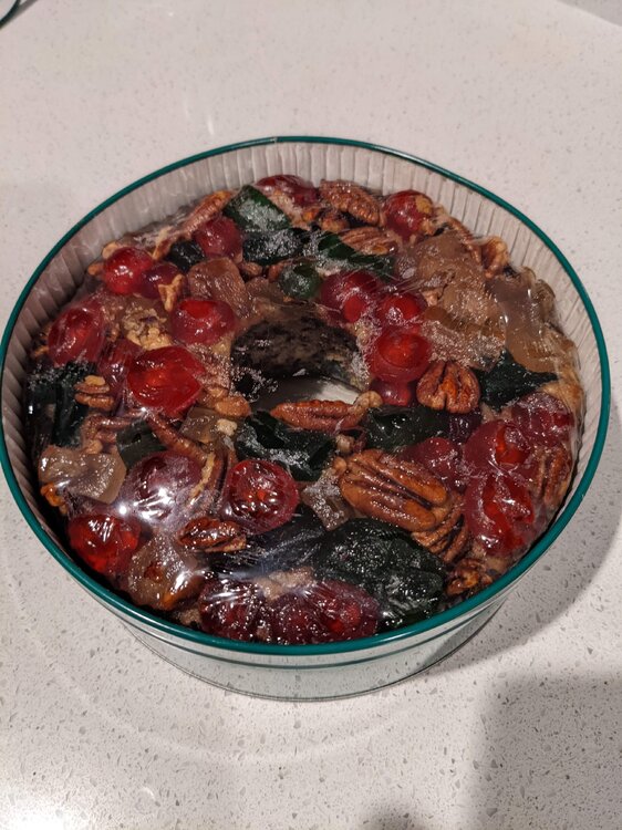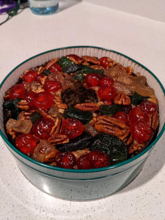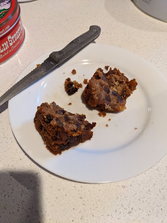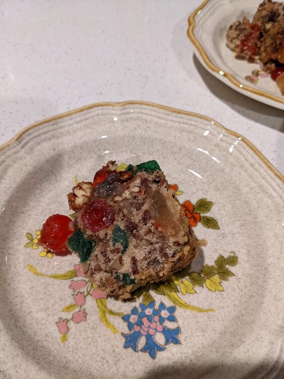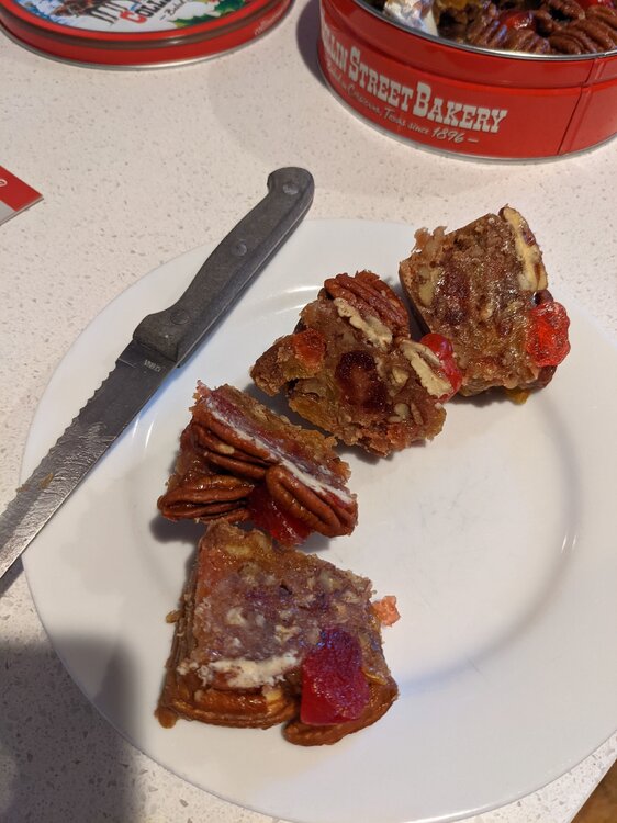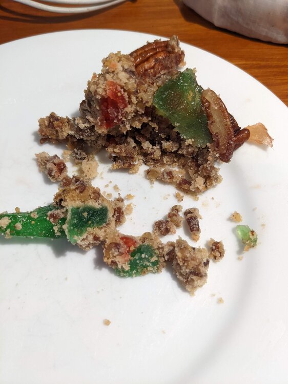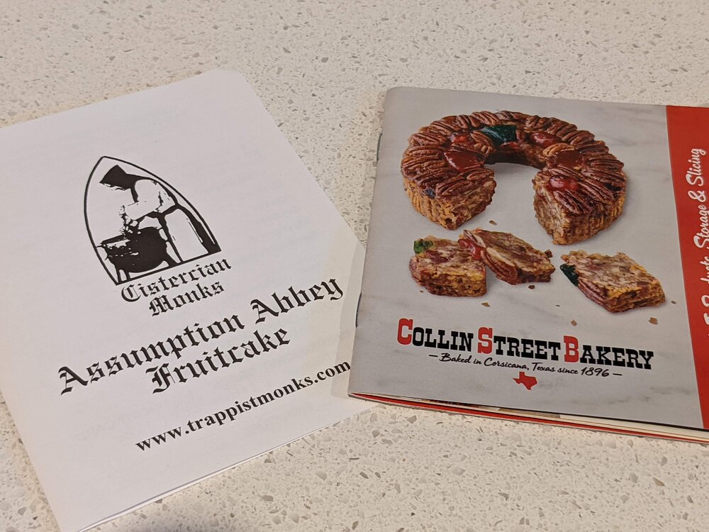 TLDR: I like fruitcake and took pictures. Growing up, my grandparents and great-grandparents would always have fruitcake in the house for Christmas. It would live on the kitchen table and was up for grabs to pair with your breakfast or a cup of coffee or just as a snack. It generally wasn't for dessert, which was the exclusive domain of pie. Fruitcake always came in a tin, and the tin was always saved for storing and sharing Christmas cookies. As a kid, I didn't have much of an appreciation for fruitcake. I craved straight up sugar, and that's not what fruitcake offered. But, I relished those candied cherries on top and over the years the fruitcake tin on the table became an enduring symbol of Christmas with my family. As I grew up, I eventually learned to appreciate the deliciousness that is fruitcake. It was a quintessential tradition that I could observe passed down from one generation to the next.Over the years, life got complicated and it was difficult to get back home for Christmas. We had fewer opportunities to gather together and that shared fruitcake on the table became a less common sight for me. The family elders passed over the years. My last living great-grandmother passed nearly 20 years ago and my final surviving grandparent (my mom's mother) passed away earlier this year. Last year she buried her last living sibling. This year she buried the first of her daughters. I think that was enough for her. A void's been created that leaves me missing those traditions of Christmases past.Thus, I felt compelled to bring the fruitcake tradition to my nuclear family and create that experience for my own children (now 10 and 6). But, does the fruitcake of my youth deserve to occupy the prominent space on my table as the fruitcake of the future? I wasn't so sure. And so, my search began to discover whether a fruitcake exists that can supplant my grandparents' favorite.Last year I ordered two different fruitcakes and enlisted the family to help me evaluate which is best. The offerings for consideration: #1 Assumption Abbey Fruitcake from Ava, MO - This is the fruitcake my family would always order. Probably because my dad's family was Catholic and they valued the connection to the monks. These are Trappist monks and hence they make Trappist fruitcake. They make good beer and good fruitcake. Apparently there are other Trappists in the US making fruitcake, but this is the only one I've tried. As the traditional fruitcake of my family, it was the first I brought to my own table.#2 Collin Street Bakery Fruitcake from Corsicana, TX - I've lived in Texas more than 30 years and this seems to be the most widely publicized fruitcake in the state. Despite living here so long, I've never tried it myself. After years of driving past their stores, it seems like it's finally time to give the fruitcake a shot.Our experience and observations are shared here with you to help make the world a better place this holiday season. My search for life-changing fruitcake will continue, so please share any recommendations you have!Packaging & StorageAssumption Abbey (AA) showed up in a round, white tin with gold trim. The lid features a simple name and logo for the abbey in black. I'm delighted by the fact that this fruitcake is shelf stable for 2 years, no doubt a result of the booze infusing it. Getting 2 years of utility out of a 2 lb doorstop, followed by a tasty treat is just good value for your dollar.Collin Street Bakery (CSB) came in a round, red tin that felt a bit thinner than the one from AA. The name of the bakery is printed in a stylized white font on the side of the tin. The lid features a festive (some would say busy) collage of Texas related holiday scenes. This fruitcake came with a brochure from the bakery offering an overview of all their products and handling instructions. Sadly, the fruitcake only seemed capable of lasting a few months even if stored in the fridge.Personally, I like the simple, clean packaging from the abbey. This, coupled with the extended shelf life, gives AA the edge in this category. AppearanceInside the tins is a different matter. The AA cake is wrapped around the sides in red wax paper. The cake is dark brown with 4 pecan halves and 4 cherry halves evenly spaced on the top.The CSB cake is wrapped in gold foil. The cake is a bit lighter shade of brown, but it's hard to tell because the top is completely covered in pecans. Several chunks of candied fruit are mixed in among the pecans.The AA cake looks very clean, but the field of pecans was more appetizing on the CSB cake. So CSB takes this category. Taste TestAA is a dark, moist cake with a deep, complex flavor. Chunks of fruit and nuts are evenly spread throughout the cake. The cake itself has just a bit of crumble to it, but holds together nicely. The cake is definitely sweet, but this is balanced with some tart, bitter and roasty flavors from the wine, currants, citrus peel and rum. There's a bit of cinnamon in the cake, but it's not heavily spiced. CSB is a whole different animal. CSB Fruitcake : cake :: circus peanuts : peanutsFrom the moment I sliced this, it obviously had a completely different texture. This was apparent in the tasting as well, where my wife and I felt this ate more like a fudge than a cake. It's a smooth, creamy and sticky texture that doesn't have any sense of crumbs in it. The flavor matched this. It really came across more like candy than the semi-sweet cake that I'm used to. There was no ingredient list provided, but the website brags that pecans are the biggest ingredient along with fruit and honey. That's how it tastes. I would even say it was cloyingly sweet. My kids loved it. And served in small portions like fudge, it worked well. But, I didn't get any of the bite that comes from wine, currants and rum. I wouldn't eat it with my coffee in the morning. The winner is a matter of preference here. If you're going for a no-chocolate, nut fudge, CSB is solid. But I'm looking for something much 