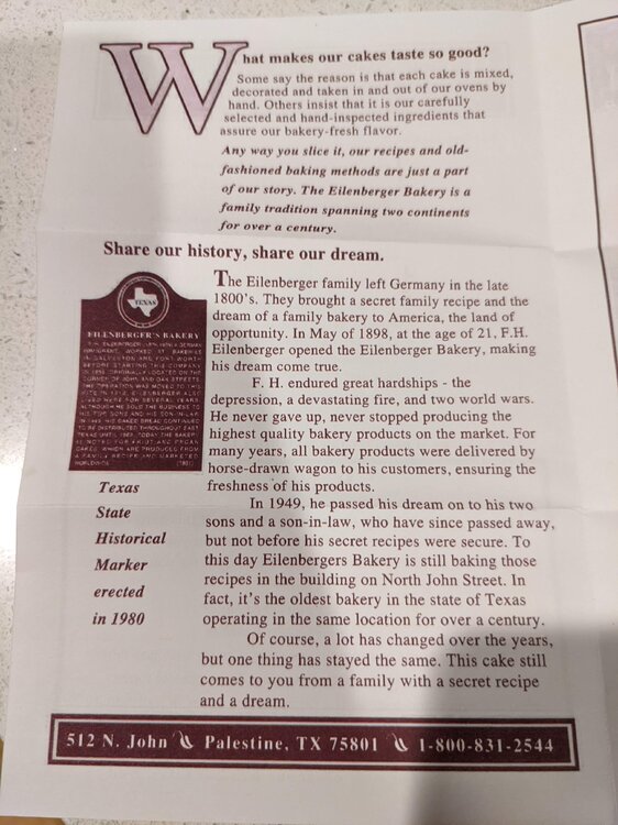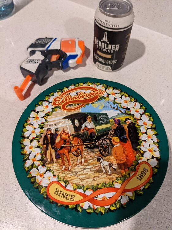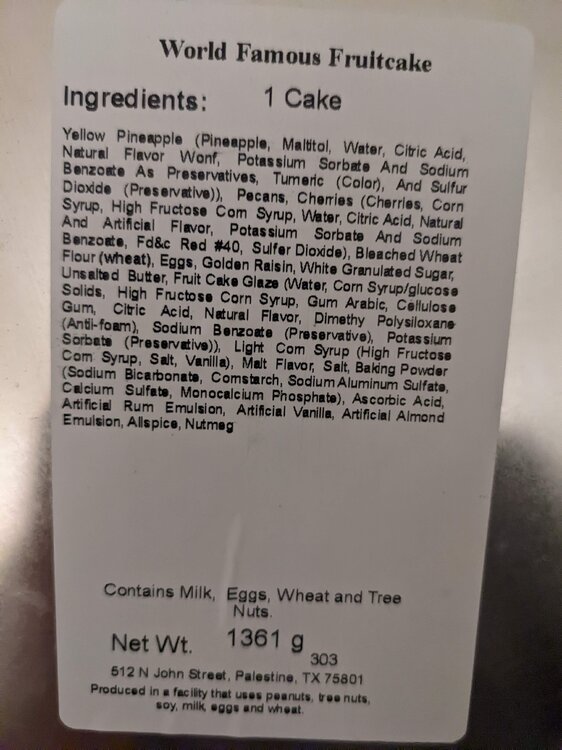 Sorry, it took me a while to eat and review this new fruitcake. Fortunately, you're not missing too much if you don't get a chance to order one of these this year. Thanks to a gift from work, I was able to order a new variety of fruitcake from Goldbelly this year. This one is a 3 pound cake from Eilenberger's Bakery in Palestine, TX. I expected this East Texas offering to be about 20% more racist than other fruitcakes, but otherwise I had high hopes. Packaging & Storage The Eilenberger fruitcake came in a round, green tin with a turn of the century scene on the lid. The design is nice, but the tin itself was thin and flimsy. You can sort of see next to my beer can where the tin was dented in shipping. So unfortunately, I'm not expecting to get much reuse out of the tin. This fruitcake didn't come with much direction on storing it, but we learned as we ate it that it actually dried out fairly quickly once it was opened. Finding a better way to store/seal it might have been helpful. Appearance The top of this fruitcake is absolutely covered with nuts and fruit. That's not surprising since the first 3 ingredients in the fruitcake are pineapple, pecans and cherries. It definitely looks delicious inside the tin. Taste Test As you'd expect based on the ingredient list, this cake is extremely heavy on the fruit. So much fruit! And lots of good sized chunks of nuts. There's actually so much fruit that the cake can collapse a bit when slicing it, so chilling it might have been a good idea. This cake has a really good flavor, definitely centered on the fruit. It's not as dark and complex as Assumption Abbey, but it's not as super sweet as Collin Street. It's somewhere in between those two. There's definitely a cake texture to this one, which I prefer. Because there is so much fruit, the cake tended to crumble a lot and the cake started drying out fairly quickly for some reason. I was often left with a pile of cake-coated fruit that I was trying to scoop up with my fork (see the second photo below). It didn't have the moisture to stick back together. So, overall, the flavor was good but not very complex and there was more crumble than I'd prefer. My wife really liked the flavor of this one. This was a decent cake, but not my favorite so far. This one was also quite a bit pricier at $72 (including $15 for shipping), as opposed to ~$37 for Assumption (including shipping). Collin Street was about $37 last year. As far as I can tell, Eilenberger only ships through Goldbelly, so there's probably a considerable markup in there. It's definitely not good enough to justify being twice as expensive as these other fruitcakes.