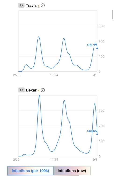 23. Yep. Color scheme takes a while to get used to. And while we're on the subject of NE, check out those Sturgis numbers in western South Dakota. Off the charts. Don't get me wrong, it's still high. Crazy high. Over 370 infections per 100k even now. (Austin is at 161 per 100k, for comparison). But the trend is hopeful. It was 488/100k on Aug. 13.