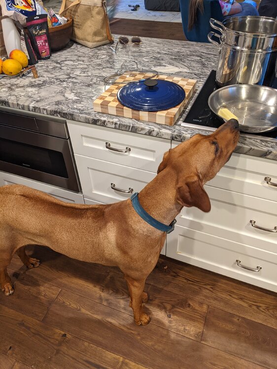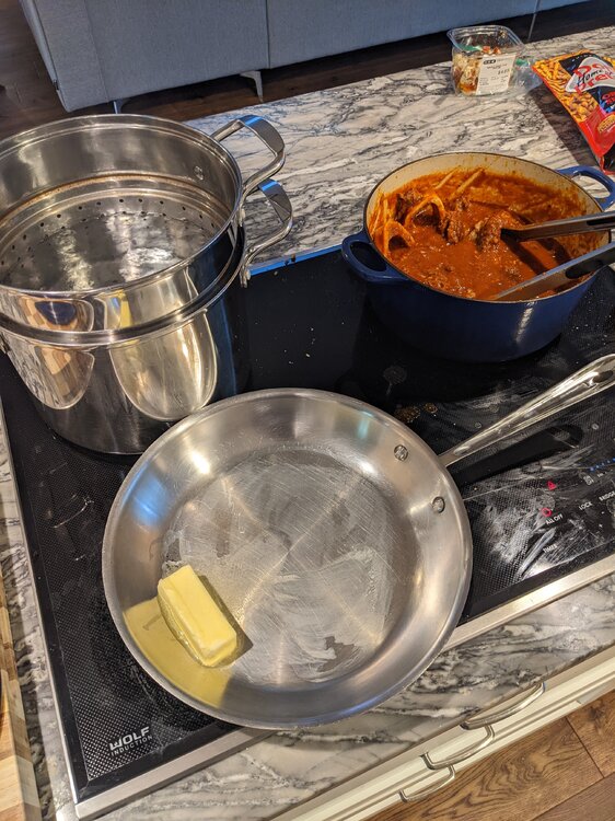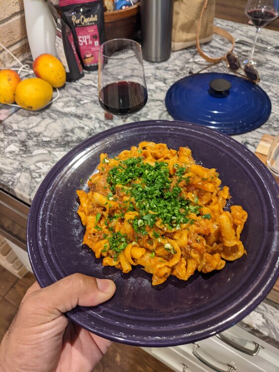 18. Made "Osso Buco" (not really Osso Buco but not sure what else to call it) - beef shank, tomatoes, wine, and more stuff garnished with gremolata - and some cacio e pepe. One of my favorite meals. Obligatory sous chef pic as well. Used a flower petal shaped pasta for the first time courtesy of Austin pasta company. Not sure what it's called but it was perfect for the dish.