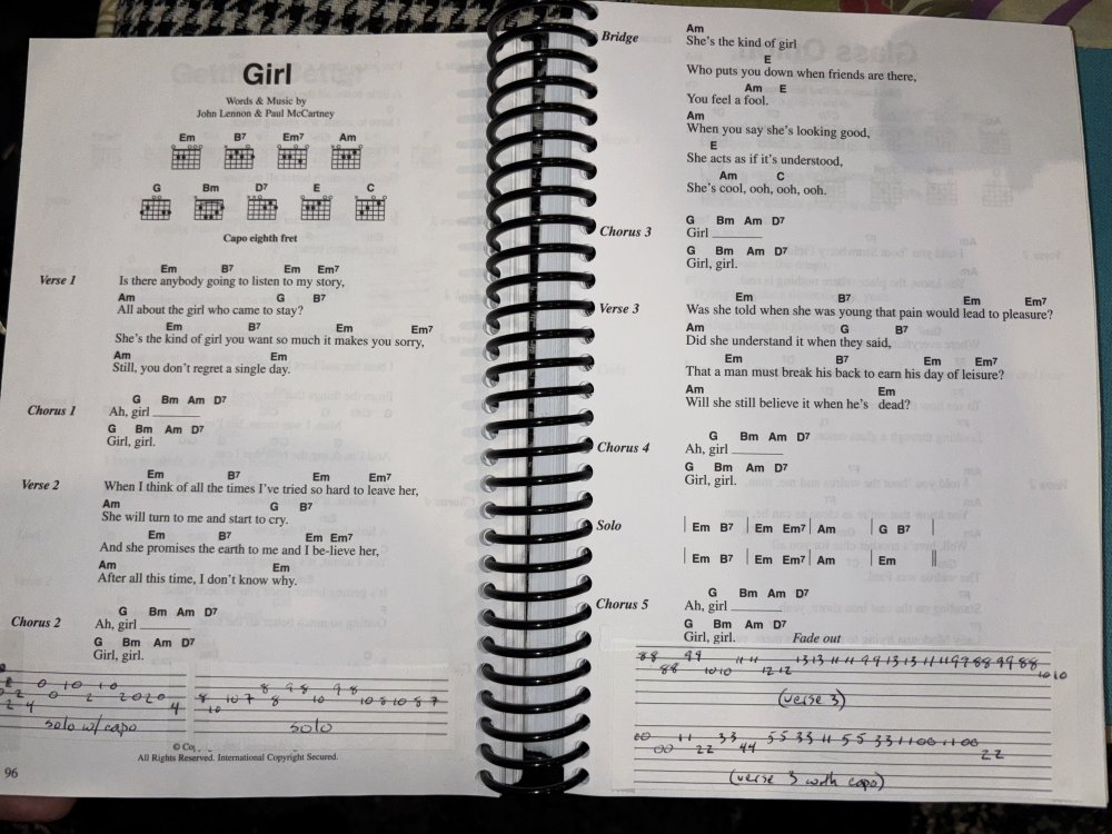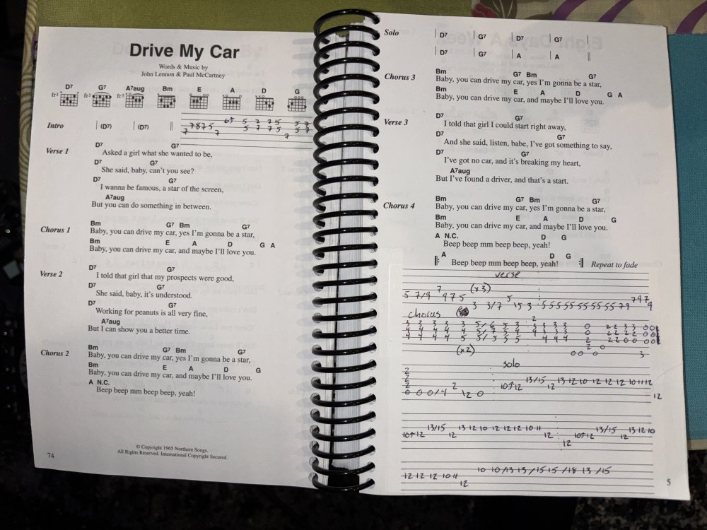 I took a spiral bound book of their songs ("The Beatles Compete Chord Songbook"), found the right song, and then opened up the same song's guitar tabs on the ultimate guitar site. The only tabs I use are the ones from PJVILL (seriously, his Beatles tabs are untouchable). I printed out blank guitar tab sheets, transcribed PJVILL's tabs onto those paper templates, cut them out, and taped them into the chord songbook. Yes, it's an old man's way of doing it but then again who am I kidding. I like paper books. Anyway, I am playing all of the songs, including chords and rhythm guitar parts. But I'm also playing anything that's not a chord and/or that featured a prominent instrument -- so that's obviously the guitar riffs, fills, and solos, but it's also piano solos, trumpets, strings, etc. Anything that can reasonably be played on the guitar. So that would include, for example, the trumpet solo in Penny Lane, the strings in Eleanor Rigby, the crazy orchestration in I Am the Walrus, the piano opener to Martha My Dear, etc. See a couple of examples below.
