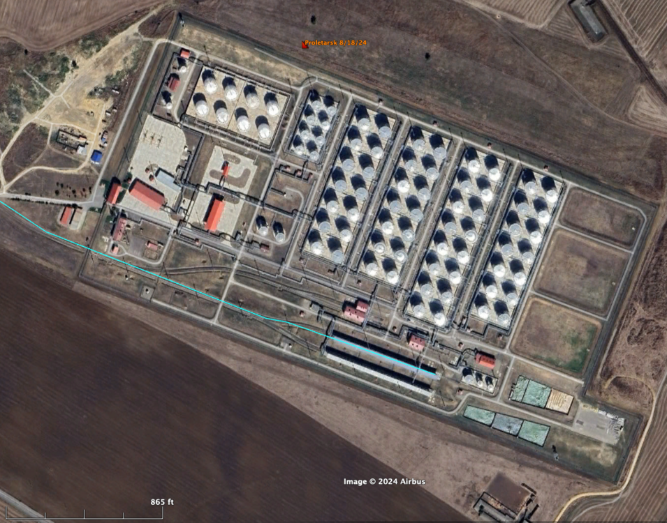 The oil facility in Proletarsk, supposedly hit by Ukrainian drone attack. The diesel fire sent 41 firefighters to the hospital. One article mentioned secondary explosions. This "oil" facility doesn't look like anything in Russia, or the US for that matter. The facility is new, built in the last 10 years. It is clean and well organized, square layout w/ uniformity, tanks appear to be on poured concrete pads, very unusual, maybe they don't have caliche. Why do they have so many smallish tanks, (70 @ ~ 70' diameter) for diesel? Why not a few larger tanks? Diesel burns, but it doesn't explode like gasoline or natural gas. It's not close to a refinery; the facility is remote, 1 mile from everything, with a dedicated, dead end rail spur. No truck loading facility, to access to water, no vehicles and no parking lot. There is a double fence around the perimeter, with guard towers at the corners. Lots of tall antenna's, weird light poles? Definitely military.