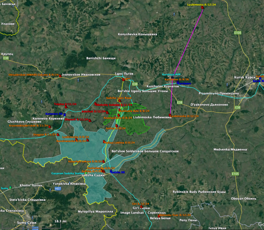 There are a lot of these little towns with the same name. The 2 different Lyubimovka's are shown directionally from the Kurskaya Nuclear Power Plant, one ~ 12 miles south, which is where I think is Ukraine, and the other about 23 miles north. My color code; the orange labels are where Ukraine is/has been (maybe just attacked, not necessarily troops on the ground) and the red labels are where contract between UK-RU has been reported. The green area is the 700' elevation plateau, the highest ground other than the area southeast of the Sudzha-Kurst Road (R200). The light blue lines are railroads. The light blue area is my guestimate of what territory Ukraine "holds", ~ 800 Sq Km. Along the road towards Lgov, it may just be a few recon vehicles and troops driving down the road looking at the farms along the way. Keep in mind, on White Tail opening weekend, one could argue that the "Texas Militia has taken over the state", given the large numbers of armed and camo'd green men with provisions for an extended stay. What is Ukraine doing here? Generally, Ukraine wants to push Russia's glide bombing attacks further rom the border. Not sure if this area fits that description. A hell of a bargaining chip when it comes time to sort all this out.. This area is only ~ 200 miles east of Kyiv, and 300 miles SE of Moscow. (Austin between Dallas and the Valley), a big cork between Russia & Ukraine, with a Nuke, the a big fucking Ga$ line. Between this area and Balarus-Ukraine border to the west, there is hardly any infrastruture. Towards the east, their is rail between Kurst and Belgorod. The terrain itself looks more like the Columbus-La Grange without any significant geographical features, towns in small river valleys surrounded by farm land. Talk about a giant cock roaches with tanks and armor and F-16's. Other than carpet bombing the area, not sure how Russia can get them out. Tanks pulling up at a Denny's for breakfast? I love it!!!