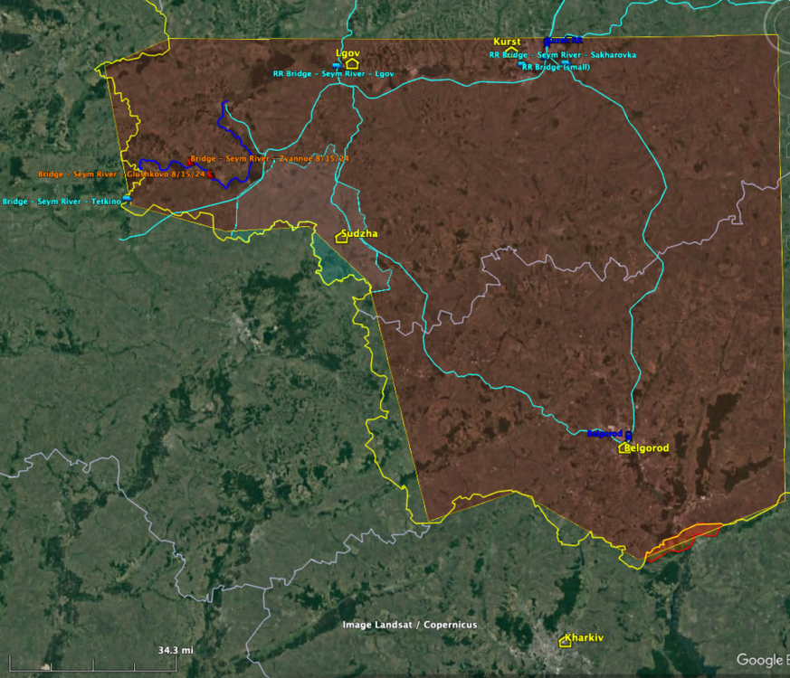 Thanks! Not to make this about me ... but its about me! Growing up around B-52's, I never liked Russia, and over the past 900+days, I have come to hate damn near everything about them. But this board wouldn't be here without them. I read your posts on other threads here, but nothing else come close to this one. And the info shared by so many here as been one of the most educational opportunities In my not so young life. I have all these obscure, useless facts taking up precious space in my head, things I will never talk about, unless its to myself, and I can't be here for 10 minutes without those factoids bubbling up from long term storage. Coupling what I think I know or remember from long ago with a wiki query and a Google search and the information at our fingertips is light years different from using a card catalog and the Readers Guide to Periodical Literature. I have other vices from the days of my youth, so if I take off on a circular tangent, ... be nice. This response was to your quote on the B-52 sortie from Barksdale to Iraq. I "know" a B-52 from Barksdale went down with a nuke a long time ago, but only because my company, before my time, had to relocate some pipelines in the general area. There is so much info out there now on all these things that were classified when we heard about them, but not on everything. So, now Biden is reading Surly? From the link: When you start adding up all the bits and pieces left of what was Russia's domain and arsenal of destruction from the Cold War, there isn't much left. Other than the nukes. The green area is bordered on the west and south by Ukraine, on the east by the Ukraine forces, and on the north by the River. I'm having a hard time seeing how (or why?) any Russians could get down there in the first place (see below), unless they were baited to come on down ... Taking out the bridges is strategic. If Ukraine takes out the 3 rail bridges over the Seym River at Lgov and Kurst, Belgorod is cut off from rail service from the north. Rail to Kharkiv would still be an option. The polygon is 10,000 sq miles. Lions & Tigers and Bears? How about F16's & Abrams & Challengers & ATACMS & JASSMs? "You have horses golf carts and motorcycles!!! What were you thinking? You ignorant servile scum!" Fixed it for Webster. That's a Bingo! My Google Earth sleuthing indicates the video is of the Seym River Bridge at Zavannoe. Apparently the one at Glushkovo was also hit, but the video is mislabeled. You can see the waves washing up on the banks in the video. The banks are not exposed on the Glushkovo Bridge. My parallel is drilling for oil & gas wells. It used to be hit miss; lots of dry holes. Not anymore. It's hit, hit, hit. Shits happening fast!