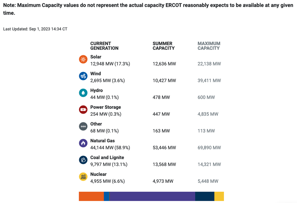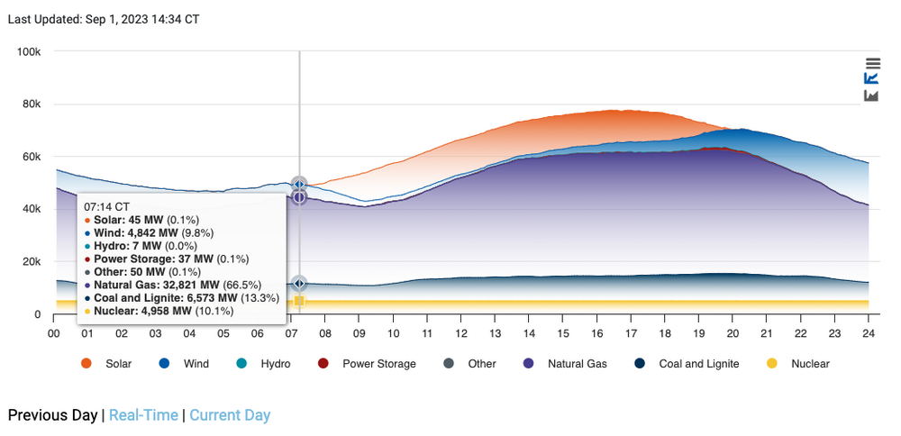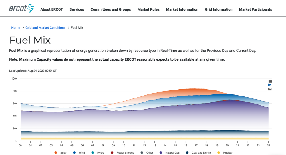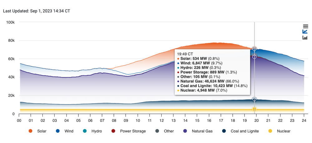 The "local news" has an agenda, a combination of ignorance, hunting for clicks, and an intent to cater to their audience, ... Re: ERCOT Fuel Mix from yesterday, 08 23 2023. Coal & Nuclear (at the bottom) are the "base supply", always on with little variation. Solar & Wind (at the top) are the "intermittent supply", on/off based on variable atmospheric conditions, with solar having the most extreme variation. Natural Gas (in the middle) is the swing supply, on/off or increased/decreased based on the supply demand profile. Notice how the wind generation tapers off in the early morning hours and there is a slight increase in gas generation. As solar generation begins and wind generation increases, the increasing "renewable" supply is ~ equivalent to increasing demand, and there is a marginal change to gas generation. As demand increases through the hottest part of the day, the renewable supply is max'd out and the new supply is ~ 100% generated by natural gas. As the solar and wind power generation decreases in the late afternoon, gas power generation increases and peaks to satisfy the increasing demand profile. THE ONLY THINGS PREVENTING NATURAL GAS POWER GENERATION FROM HAVING A SMOOTH SUPPLY PROFILE IS THAT, (i) there is not enough gas, or (ii) NATURAL GAS POWER GENERATION IS "INTENTIONALLY THROTTLED (by ERCOT)" AS IT IS SIMPLY NOT NEEDED. (Yes, I am intentionally shouting because this same shit is posted every damn day I look over here, which thankfully, is about once every 3-4 weeks.) The "unexpected lack of generation" is simply an ignorance of not being able to understand a simple concept, that at a specific point in time, it is simply not needed due to the availability of other supply, primarily solar. The natural gas power generation is reduced, per ERCOT, because it is not needed on a real time basis. Please note how the power generation profile for natural gas very closely tracks the total supply/demand profile, which is indicative of the natural gas supply being the primary swing (variable) supply in the power generation portfolio. Ii is not that complicated, if you need more power, burn more gas. With that said, a cloud, or a tropical storm, drifting over a solar array can be offset by existing operating facilities ramping up production, on demand. A major generation facility dropping offline or a transmission line interruption is a much different issue.