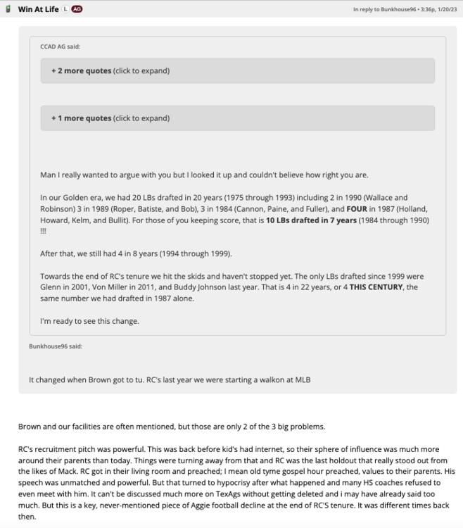 Cut & Paste newbie ... "RC's recruitment pitch was powerful. This was back before kid's had internet, ... RC got in their living room and preached; I mean old tyme gospel hour preached, values to their parents. But that turned to hypocrisy after what happened and many HS coaches refused to even meet with him. It can't be discussed much more on TexAgs without getting deleted and i may have already said too much." -