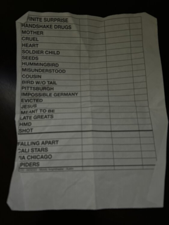 14. he made mention of eating too many pot cookies, but it was part of a story he was telling about a prior show. thats how i took it at least. they are pretty tight this tour, that venue left a lot to be desired.