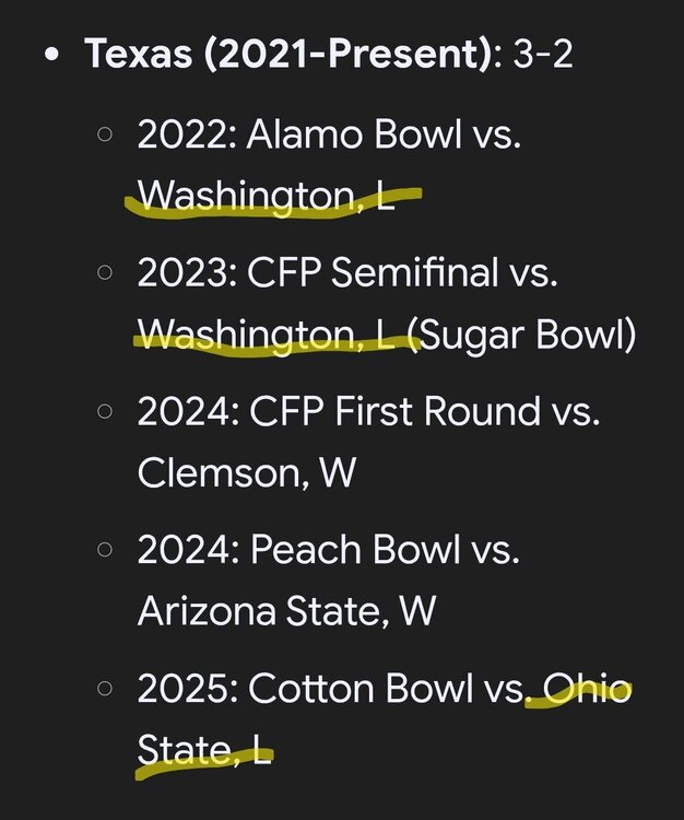 You referenced being an alcoholic and the insanity of doing the same thing over and over again and expecting different results. While I do think it relevant, I think the more applicable item here is the control aspect. Sark is unwilling, despite results, to relinquish control of the offense. Instead, he chooses to believe he is capable of both and his ego has gotten the better of his logic and reasoning. As I see it, the only thing that will change this is CDC flexing control, sitting Sark down and telling him to bring in a new staff to run the offense completely or option b is winning an NC in 2026 or lose his job. Put a clock on it with extreme goals. Dunno what Sark will choose, but it's the only way this gets fixed.