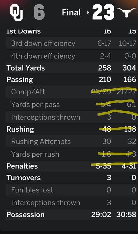 We absolutely were more disciplined. While we had a couple of painful penalties we only had 4 vs ou's 5. Prior we were averaging over 10 per GAME, iirc. Imo, this is a factor of both the less complex blocking scheme, quicker throws and moving the pocket in addition to just playing better and pulling their heads out of their assess. We beat them in every single key offensive stat, and as much as we love to shit on OU and Venables their defense is actually pretty good. For all these reasons I really do think this was among Sark's best game plan and game adjustments he's made during his tenure. It provides me some cautious optimism because we've sadly seen him go right back to what wasn't working despite all evidence he shouldn't.