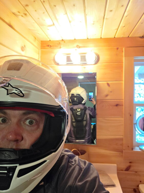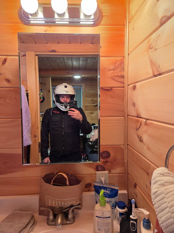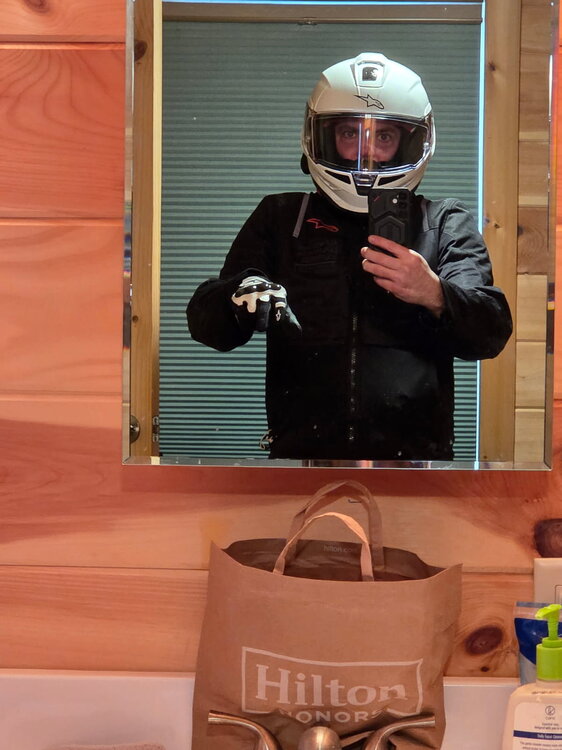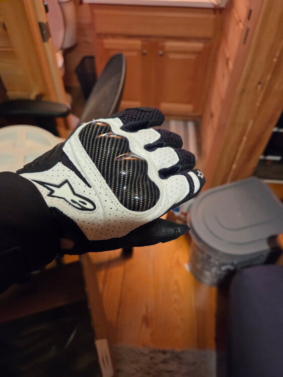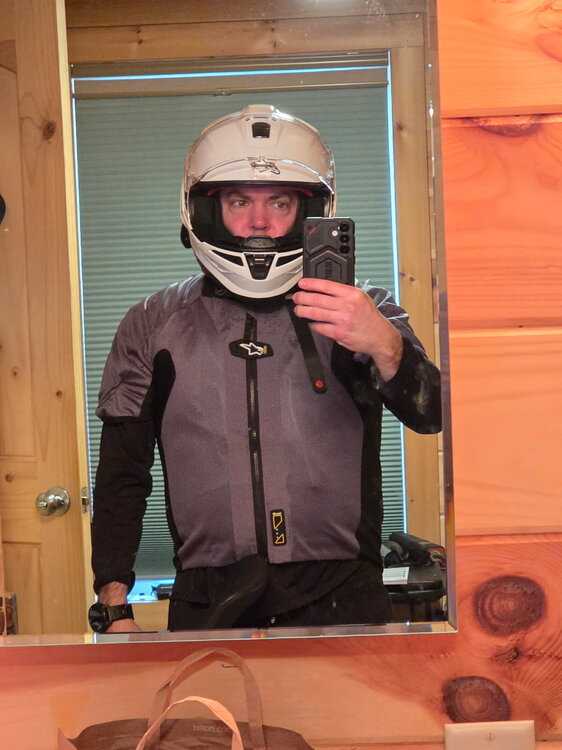 8. Haven't posted in a while. Weather has been brutal recently and I'm not riding as much as I'd like. Dealing with a health issue as well. (Bad hip) That said pre-summer I went out and got a bunch of new kit. I wanted to upgrade my 8 year old Shoei, and chose to go with Alpinestars Carbon Fiber. Got a Alpinestars Tech-Air 5 Im just gonna list all my gear below. When I get a moment I'll update with my takes. RST Moto Maverick Evo CE Pants RST Moto Tech Pro CE Jeans Alpinestars Supertech R10 Carbon Helmet Alpinestars ST-2 Air Jacket Alpinestars SMX-1 Air v2 Gloves REAX Fulton Air Riding Shoes All of it is CE level 2 and AA or AAA abrasion resistance. Its mostly white and largely comfortable below 90 degrees. Above 90 it gets hot. Some pics so you known it happened.