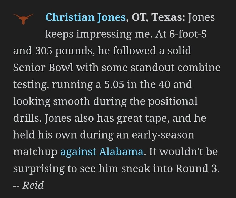 Ja'Tavion Sanders, TE, Texas: Sanders (6-foot-4, 245 pounds) opted not to do the jumping drills at the combine and turned in a 4.69-second run in the 40-yard dash. Where he impressed in the workouts, though, is also where he has impressed on tape: catching the ball and operating in space. Sanders showed off great arm extension and concentration on two clean runs during the gauntlet drill. He's more explosive in the short area than he is as a sprinter, which explains the slower 40 time. Sanders is my clear-cut TE2 with a Round 2 grade on tape. -- Miller