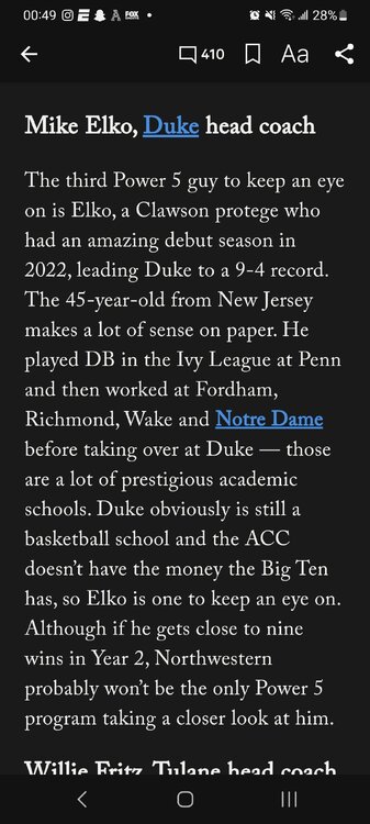 14. This was from an article in The Athletic discussing possible head coaching candidates at Northwestern. One candidate they mentioned is one Mike Elko. They decided to skip one of his jobs so they could make the point that he had worked at prestigious academic schools. Guess which school they skipped...