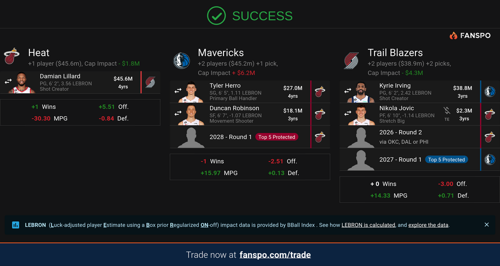 14. Herro has two glaring negatives in his game: he still takes and misses a lot of bad 2-pt shots and he does not play good defense. Both are fixable with maturity. I did think his contract had 3 years remaining rather than 4, which was wrong. Still, I would not consider his contract bad on the level of Jordan Poole or Bradley Beal. I would put it at better value than Tobias Harris's contract, for example. I think it might be interesting to watch Herro in a situation where he was the #1 offensive option and had to carry a team like the Nets. Let me toss out another shit-stirring hypothetical: Dallas-Portland-Miami: Mavs send Kyrie to Portland and get Herro plus picks, Portland sends Dame to Miami and also pick up draft picks.