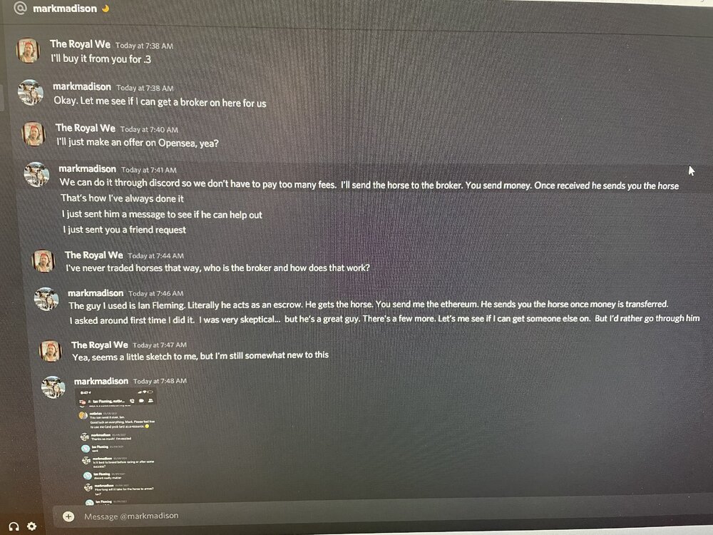 20. Have you guys bought a horse from someone on the Zed discord? I found one I want and agreed a price with the seller, but instead of me just making an offer on Opensea he is talking about using a broker on Discord and selling it through there to avoid fees?