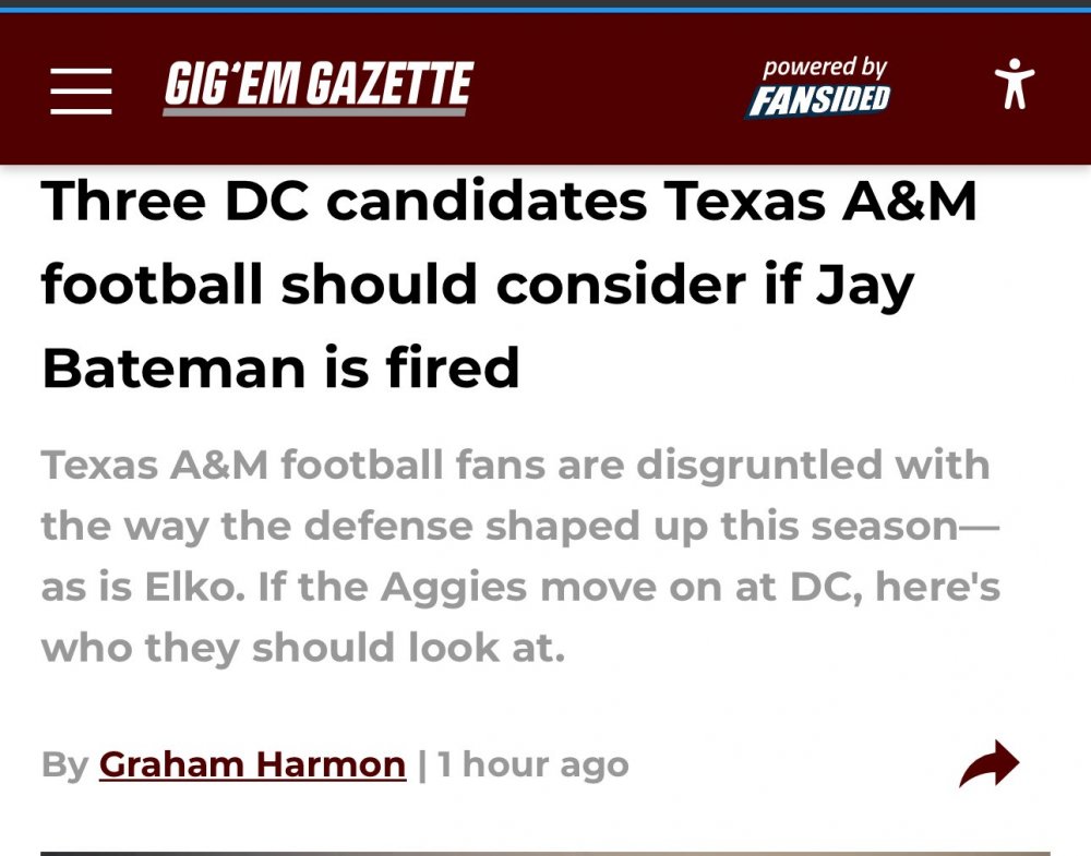 1. Any guesses on the 3 Graham has touted https://gigemgazette.com/three-dc-candidates-texas-a-m-football-should-consider-if-jay-bateman-is-fired If no one says Will Muschamp then we all are an embarrassment