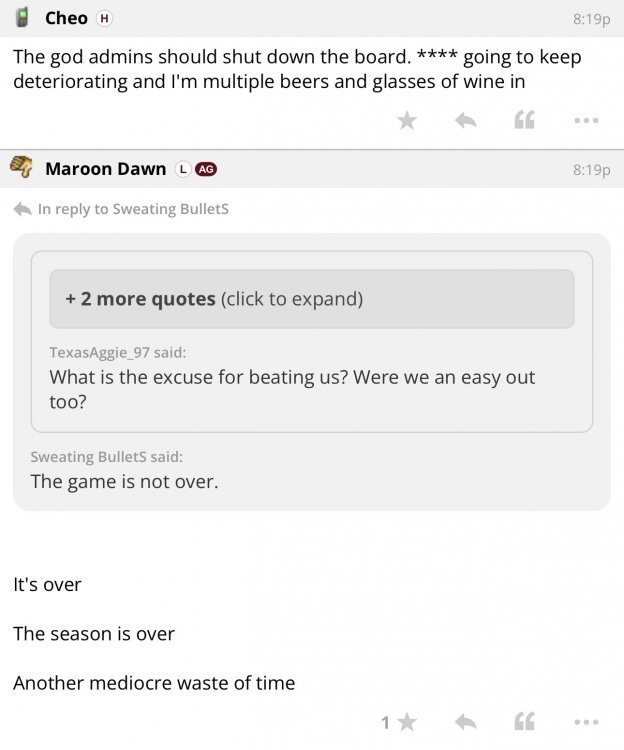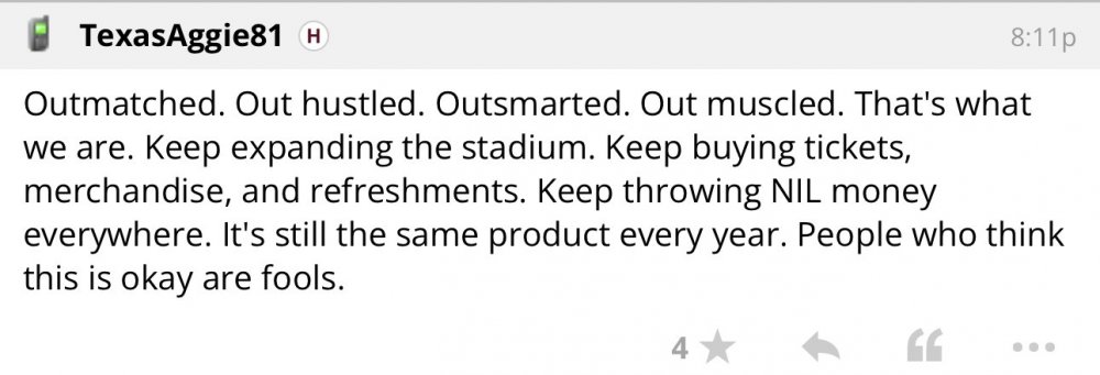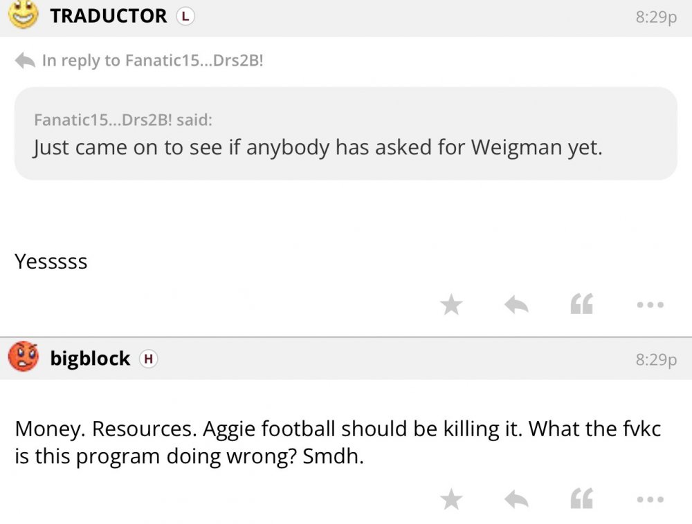 12. We are in the questioning phase…….like clockwork. We went from 12th man 🙄 to night game 🙄 to SEC night game 🙄 to the eventual “we have so much money”. Pooooooooooooooor aggy