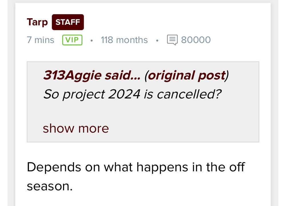 9. I’d love for Tarp to sketch out the path that turns this 7 win team that is losing their best players to the NFL and portal into a national championship contender in the offseason. Anything is possible I guess, maybe Alabama’s entire roster transfers to college station after the playoff and I’ll look like a idiot for shitting on project 2024