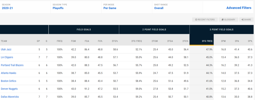 22. You are an ocean of terrible takes but I couldn't let this go. You seem to be completely clueless about the modern game. You are reminiscing about inefficient Karl Malone mid-range jumpers and feeding KP the ball 20 times a game with his back to the basket while saying teams don't win games off of shooting? https://www.nba.com/stats/teams/shots-general/?sort=FG3A_FREQUENCY&dir=1&Season=2020-21&SeasonType=Playoffs Six of the last seven champs were in the top 10 teams in the league in frequency of threes, and the 7th was 11. 2020 Lakers 11th 2019 Raptors 5th 2018 Warriors 6th 2017 Warriors 5th 2016 Cavs 3rd 2015 Warriors 1st 2014 Spurs 10th This season 7 of the top 11 of those teams are still playing. I'm going to venture a guess that as a football fan you are a "you have to establish the run in order to pass" believer.