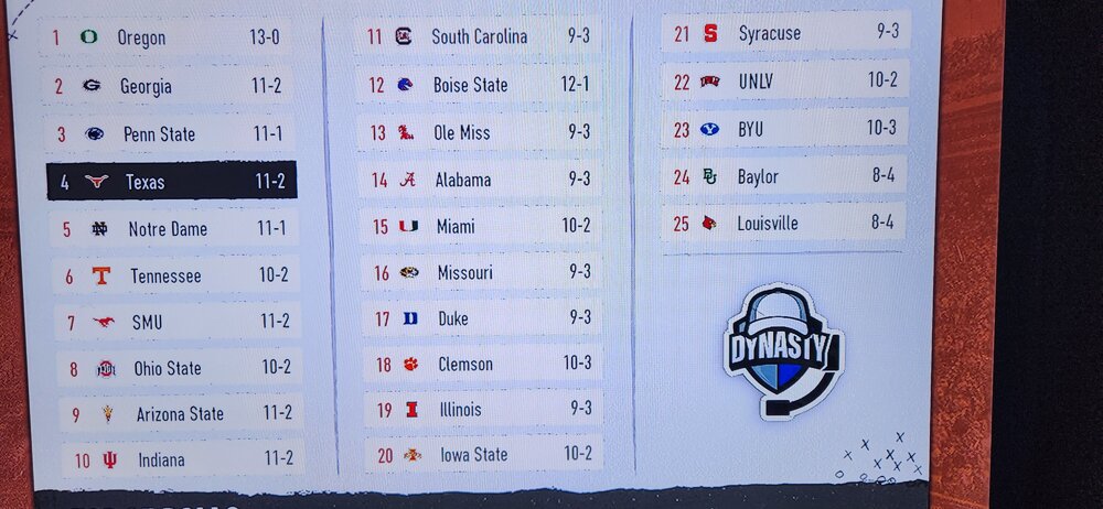 17. So I had too much time on my hands today and started a new dynasty where I forced the actual W/L results from the entire season. I will paste the final CFP rankings after the CCGs are simulated, here are the tiebreaker issues for CCG weekend: Big 12 - Arizona State is playing BYU instead of Iowa State in the CCG. MWC - Boise State is playing Colorado State instead of UNLV in the CCG. B10 - Oregon is playing Indiana instead of Penn State in the CCG Fortunately the winners are all correctly in the games so I will of course force them to win. Let's see how EA does on the final CFP rankings, so far they've been somewhat close with some strange errors here an there. For example right now Texas is #1 and Oregon is #2.