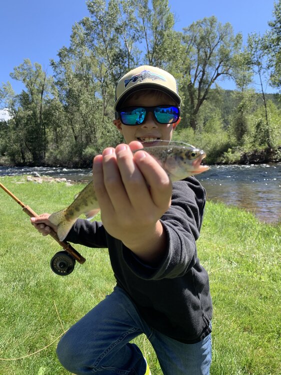 17. Oldest son caught his first trout on a fly. He hooked two big (18-20") rainbows, but after he landed this guy, all he wanted to do was fly fish the rest of the trip