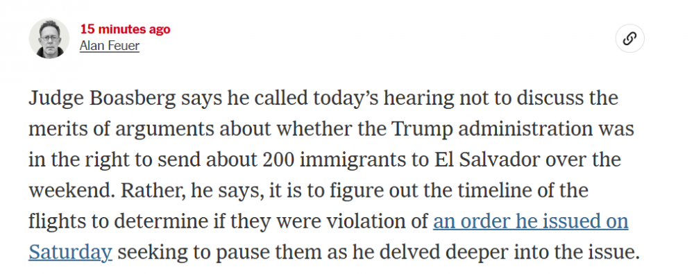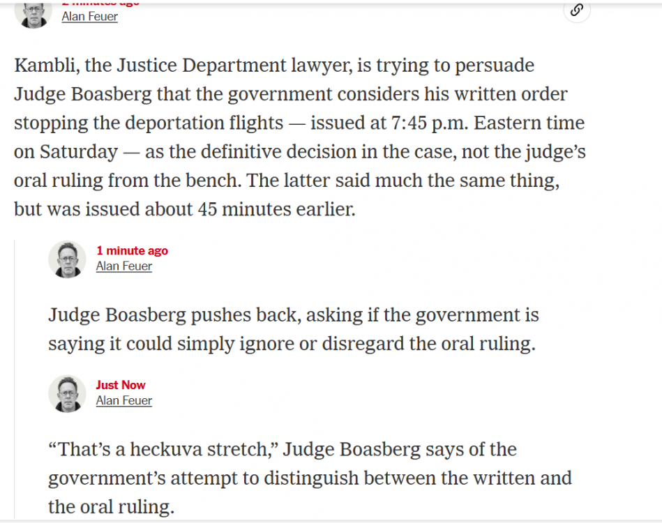 19. Here's updates from NYT March 17, 2025, 5:30 p.m. ETJust now Alan Feuer Judge Boasberg now addresses the government’s argument that it did not violate his order because the planes had passed outside of U.S. airspace by the time his written ruling came down. The judge says the problem with that position is that he still has power over the officials who make the decisions about the planes, even if the planes themselves were outside of U.S. territorial jurisdiction.