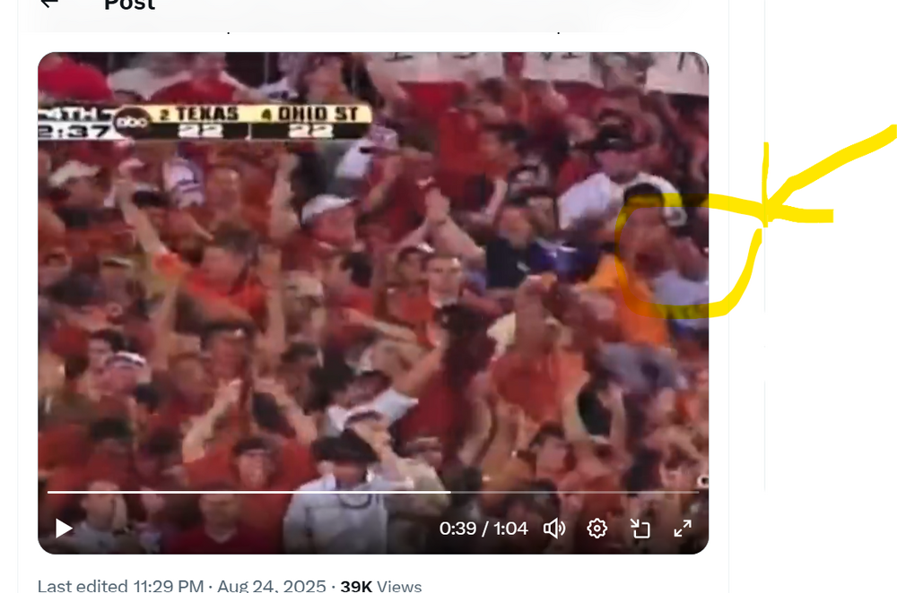 21. That's me on the right, as the cameras swept the Texas section after the Sweed TD catch... headphones and all. Incredible atmosphere, but yeah, if i was fighting man, could have easily scrapped a half dozen times, it was that bad. Got called a faggot several times walking to and from various bars /to stadium etc.. no biggie I suppose, and that was well before the game. After the game was more verbal and just outright embarrassing for the tOSU fans, but water under the bridge, that was a long time ago. We walked from stadium to downtown as the busses had stopped and several elderly fans in our throng of Texas fans needed the 'protection', so it took us a lot longer to get back.