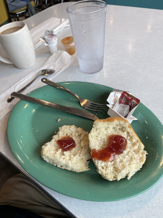 7. Had no leftover to speak of today so I took myself to Dan’s Hamburgers for breakfast. Practicing good trash discipline after what was an omelette with hash browns