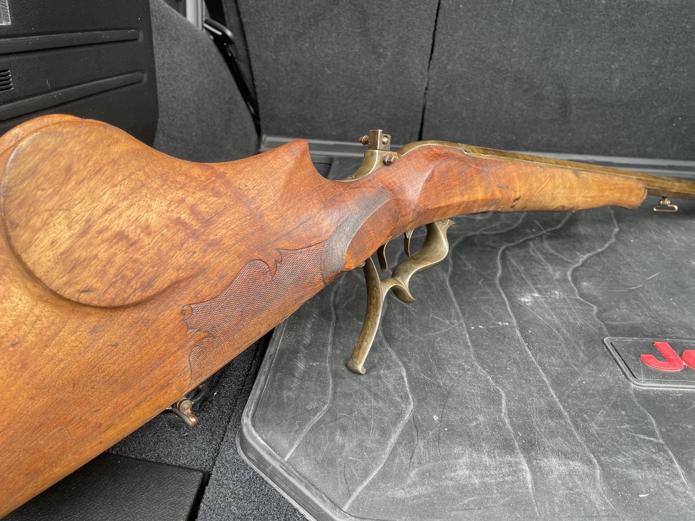 5. Anyone know what kind of rifle this is? Looks homemade, guy from work brought it in looking for answers since I’m a gun guy. Loads from about 6” from the muzzle and shoots 22LR, very heavy and has 2 triggers (one hair and the other heavy). Missing the sights and has no other markings. What say you Surly