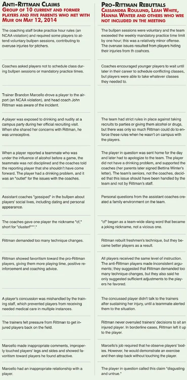 17. CoachWhite's daughter was a pitcher at Stanford under coach Rittman. She apparently led a charge to the AD to report Rittman for being a hardass. (ironic in that her dad was long rumored to be one of the hardest asses in coaching). Coach Rittman was eventually ran out of town and Standford Softball wandered the desert for several years. Rittman is a really good coach, used to assist with National Team, and now at Clemson where I have heard of zero complaints about this treatment of players. I have attached to formal complaints and Rittman's staff rebuttals to the claims. Looks like a bunch of whiny ass kids and over involved parents to me.